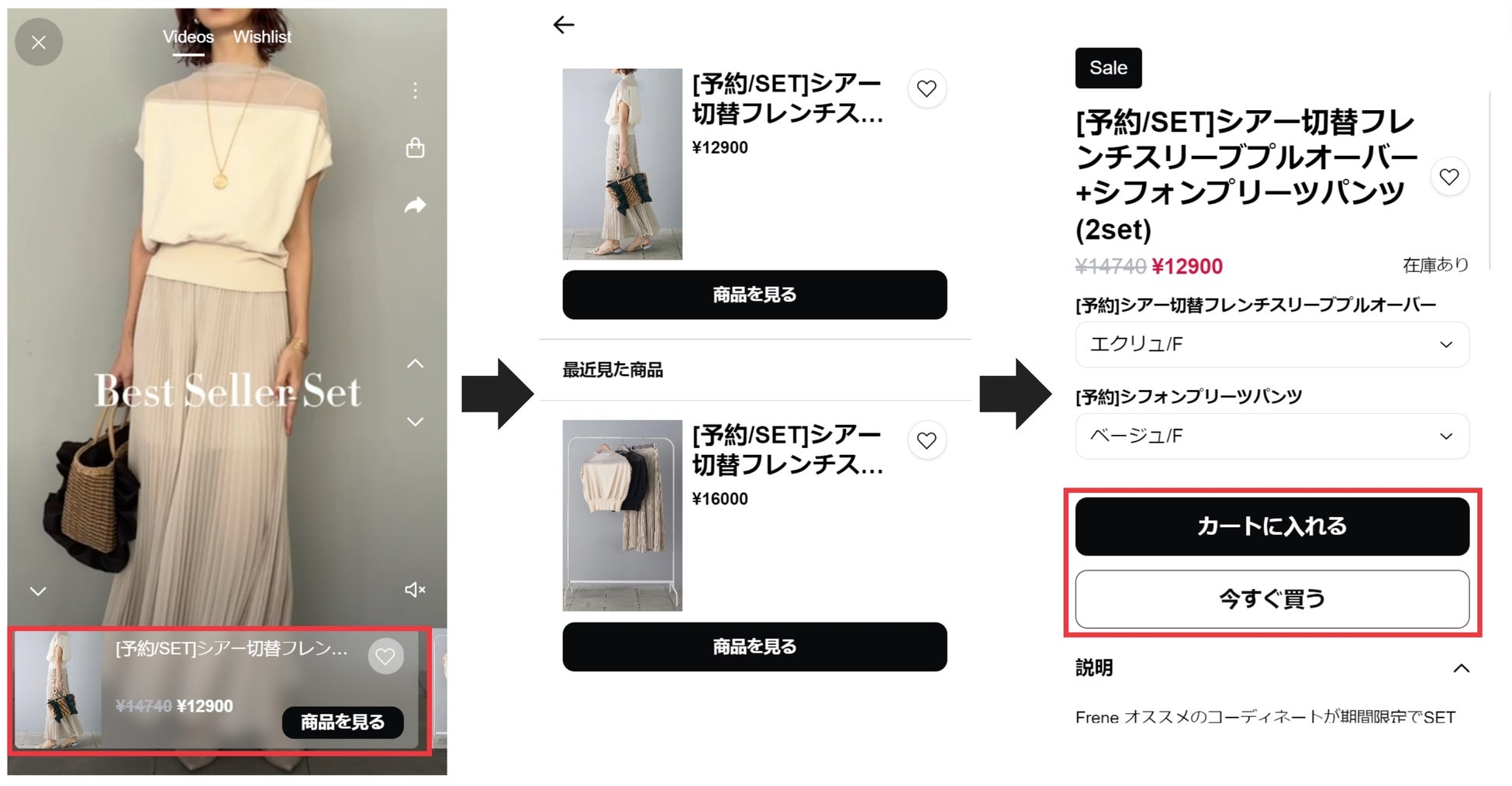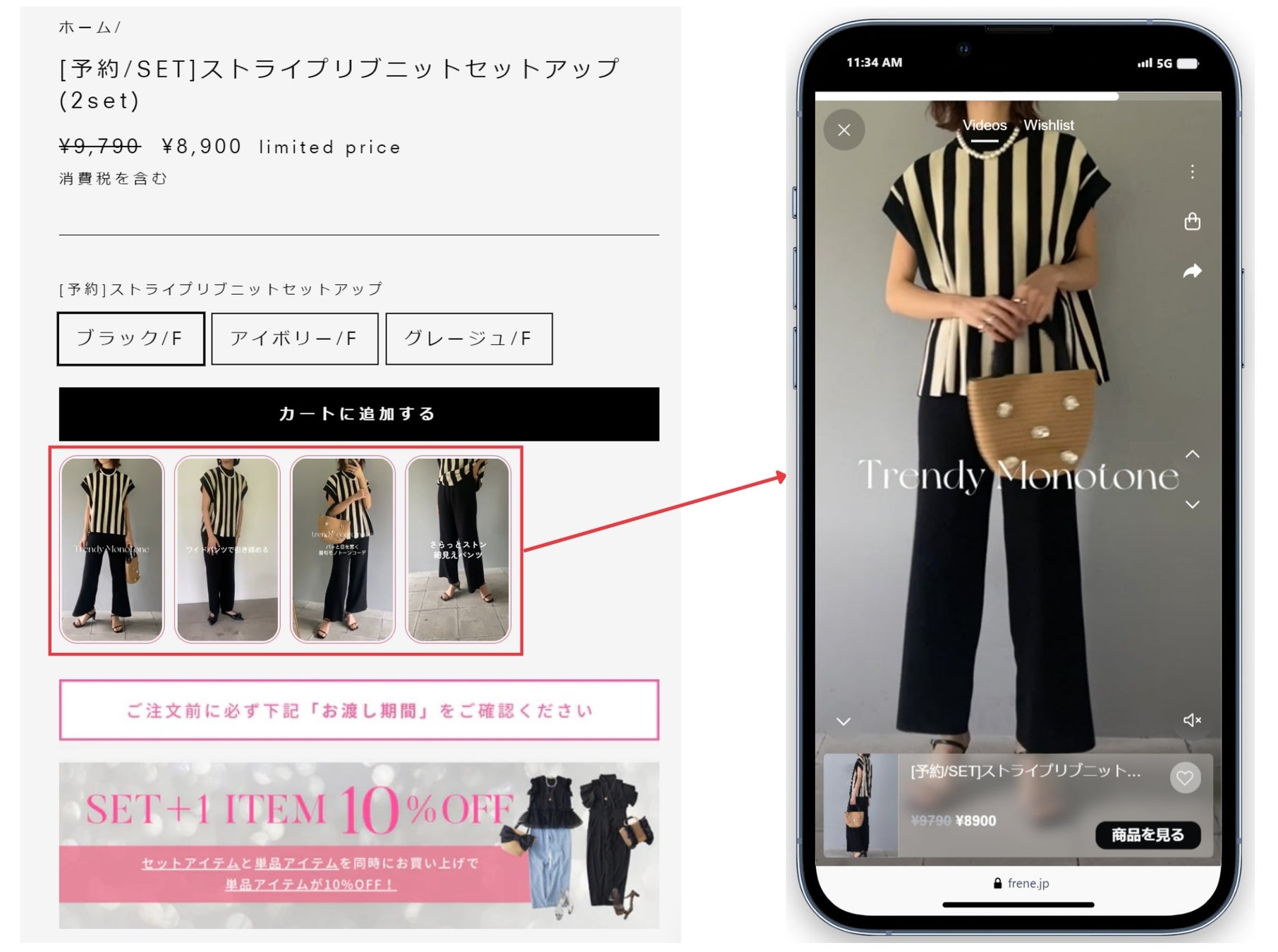 Freneのサイトでは、サイト訪問ユーザーに対してアイテムの着用イメージを深めてもらう狙いで、トップページにおすすめのコーディネート一覧を動画で追加しました。商品ページと同様にショッパブルビデオ形式のため、商品が気になったユーザーはそのままカートに追加することが可能です。