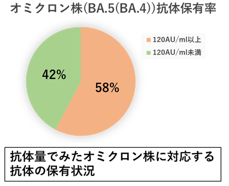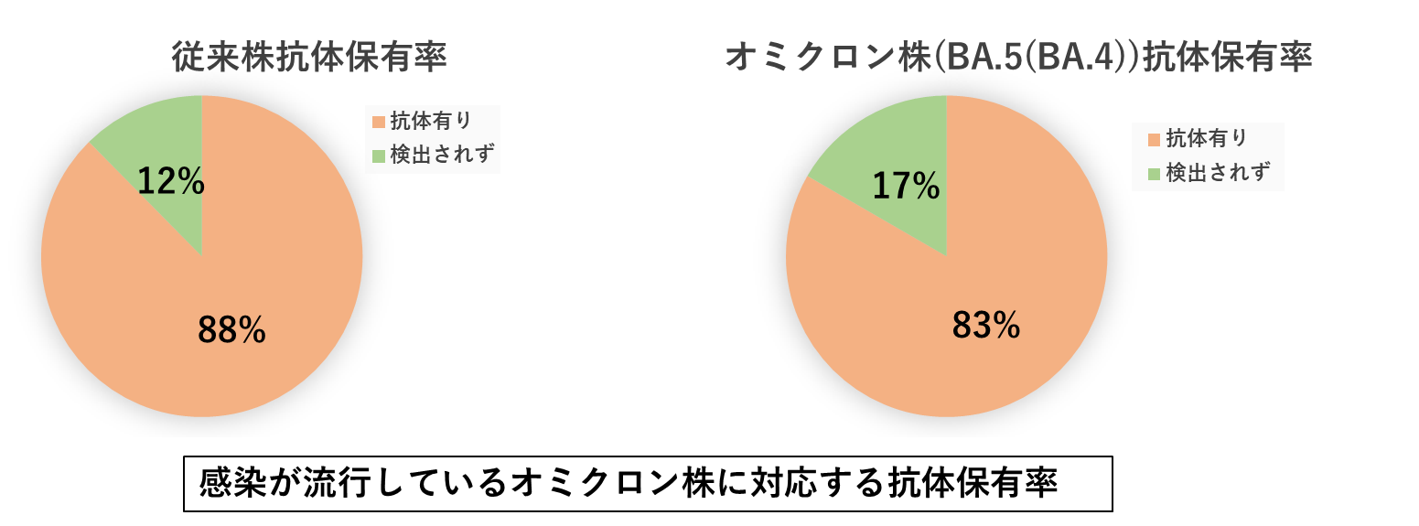 厚生労働省の第80回新型コロナ感染症対策アドバイザリーボード(令和4年4月13日) における保有状況調査の結果報告によると、ワクチンの効果(抗体産生)を示す抗体の保有率は約96%でした。しかし、ワクチン接種者の多くが抗体保有者になっているにもかかわらず、第8波が到来しています。そこで今回、当社では、従来株に対する抗体の保有率と現在感染の主流になっているオミクロンBA.5株に対する抗体保有率について調査しました。その結果、従来株に対する抗体の保有率が88%である一方で、オミクロン株BA.5に対する抗体の保有率は83%であることが判りました。 さらに、オミクロン株BA.5に対する抗体を保持していたとしても、その抗体量(抗体価)が十分でない方の割合が42%であることが判りました。この調査結果は、オミクロン株対応ワクチン接種を悩まれている方が接種するかどうかの判断材料になるのではないかと考えられます。