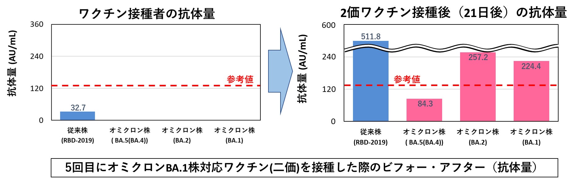 検査方法:従来株、オミクロン株(BA.5(BA.4))のスパイクタンパク質断片(受容体結合領域(RBD)[※1])に対する抗体の抗体保持量(抗体価)を調べられるイージードクⓇ『 変異株抗体検査 』によって調査した。