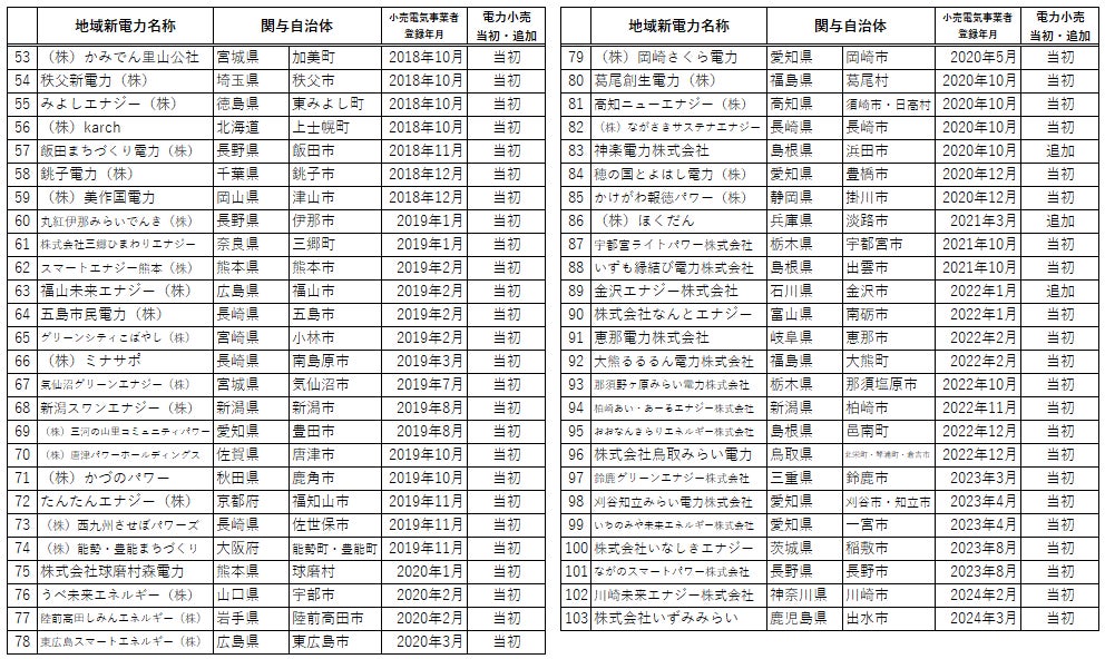 2024年4月末時点で小売電気事業者登録がされており、公表資料において次の①、②または③に該当することが確認できた法人を地域新電力としたところ、103社を確認した。