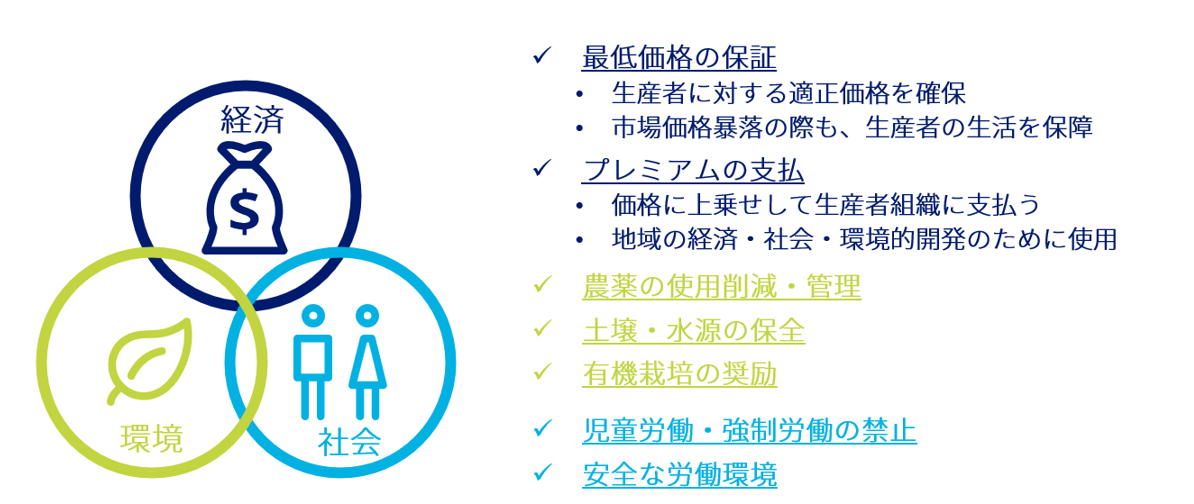 フェアトレードとは直訳すると「公平・公正な貿易」です。通常の取引では、市場価格の情報や販売先の選択肢の欠如により、末端の小規模生産者は、安く買い叩かれてしまうことが今も多くあります。その結果、生産者の生活水準低下、コスト削減を目的とした児童労働・強制労働、過剰な農薬による環境破壊や生産者が健康被害をうけるという問題が引き起こされます。フェアトレードは、人と環境に配慮して生産されたものを適正な価格で取引し、持続可能な生産と生活向上を支援する仕組みです。フェアトレードによる取引では、適正価格の保証・プレミアムの支払い、児童労働・強制労働の禁止、環境に配慮した生産などが行われます。国連のSDGs(持続可能な開発目標)の17の目標全ての達成に寄与すると言われ、特に8つ(目標1貧困、目標2飢餓、目標5ジェンダー、目標8労働環境、目標12持続可能な消費と生産、目標13気候変動、目標16平和、目標17パートナーシップ)の達成に大きく寄与すると言われています。