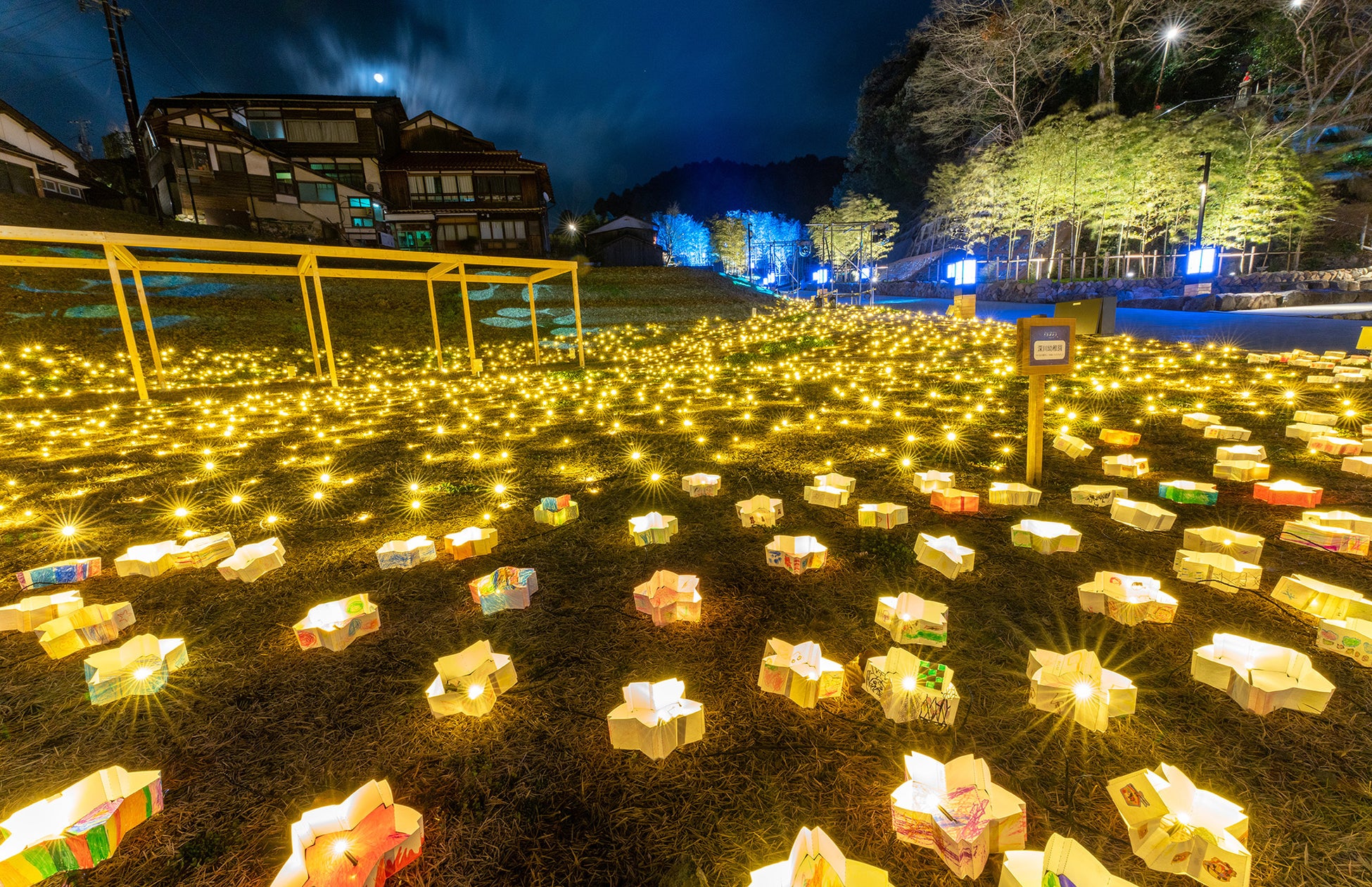 長門市内の幼保小中学校の協力を得て、児童生徒約3,000名があかりモチーフを制作。金子みすゞの3つの詩をテーマにした約3,000個のあかりが、訪れた人たちをあたたかくお迎えします。