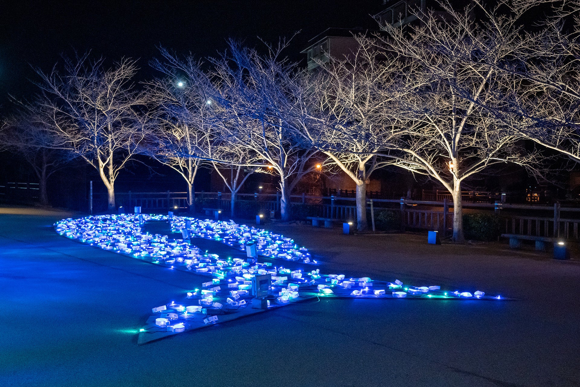音信川河川公園の中央に、大きなお魚型にあかりのうつわを配置します。真っ青な海のイメージに浮かび上がる幼稚園児、保育園児たちの作品をご覧ください。