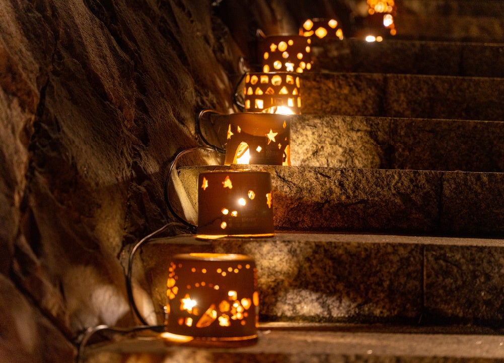 詩のナレーションや⾳楽に合わせた幻想的な光の演出をはじめ、市内の児童⽣徒が制作した「あかりのうつわ」を設置し、特別な⾵景を創りだします。