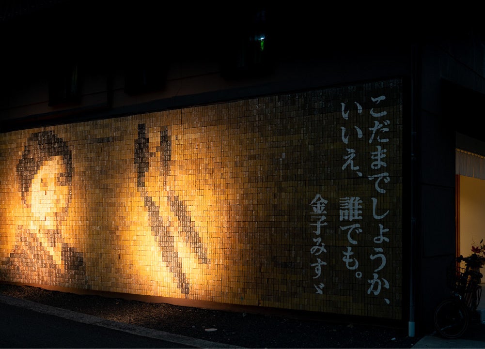 engawa YUMOTOの壁一面の大きなみすゞさんの「モザイク壁画」を、優しいあかりで照らします。モザイクの匠を近づいてみてみましょう。