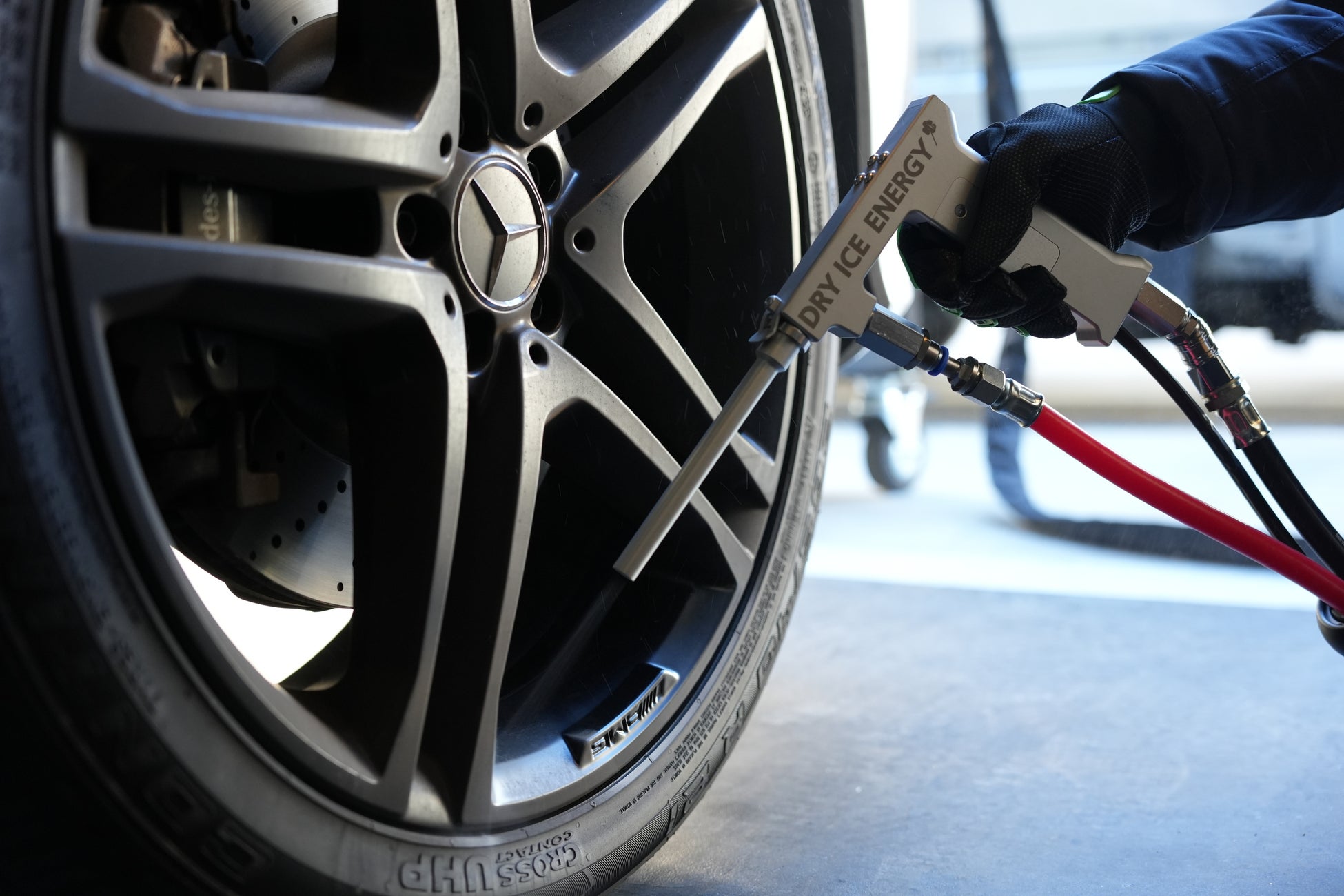 ドライアイス(3mmペレット)を圧縮エアで噴射することで、洗浄対象物を傷つけることなく、ブレーキダスト、グリース、油汚れ、泥、車内の付着物などを短時間で効果的に除去します。