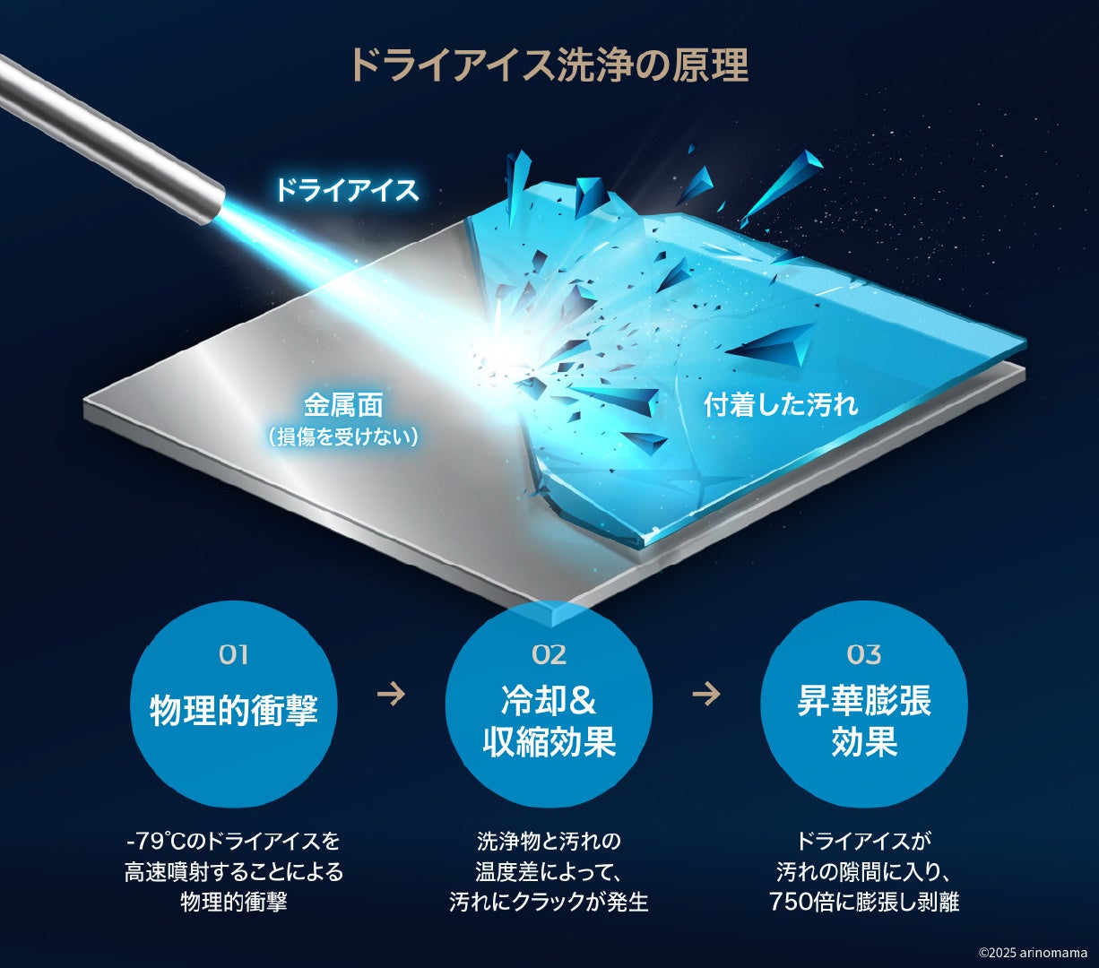 ドライアイス洗浄とは、水や薬品を一切使わずに、-79℃のドライアイス(3mmペレット)を圧縮エアで高速噴射することで汚れを除去する非接触型の洗浄技術です。