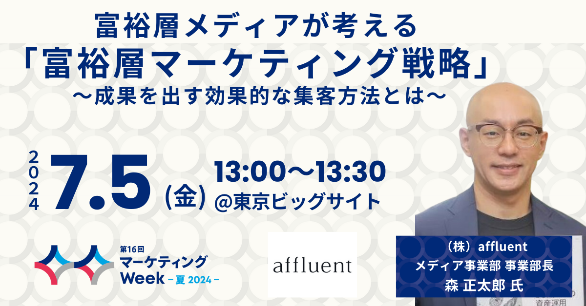 株式会社affluent(東京都港区、代表取締役社長:髙山勇樹)は、2024年7月3日(水)から5日(金)まで、東京ビッグサイト・東展示棟(東京都江東区)で開催される「第16回 マーケティング Week - 夏 2024 -」に出展します。