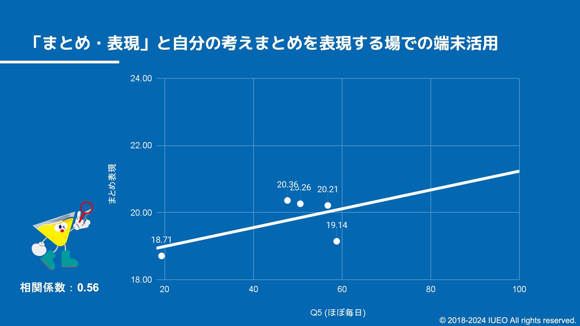 「自分の考えやまとめを表現する場」での端末活用を積極的に行っている学年ほど、情報活用能力における「まとめ・表現スキル」が高い傾向。