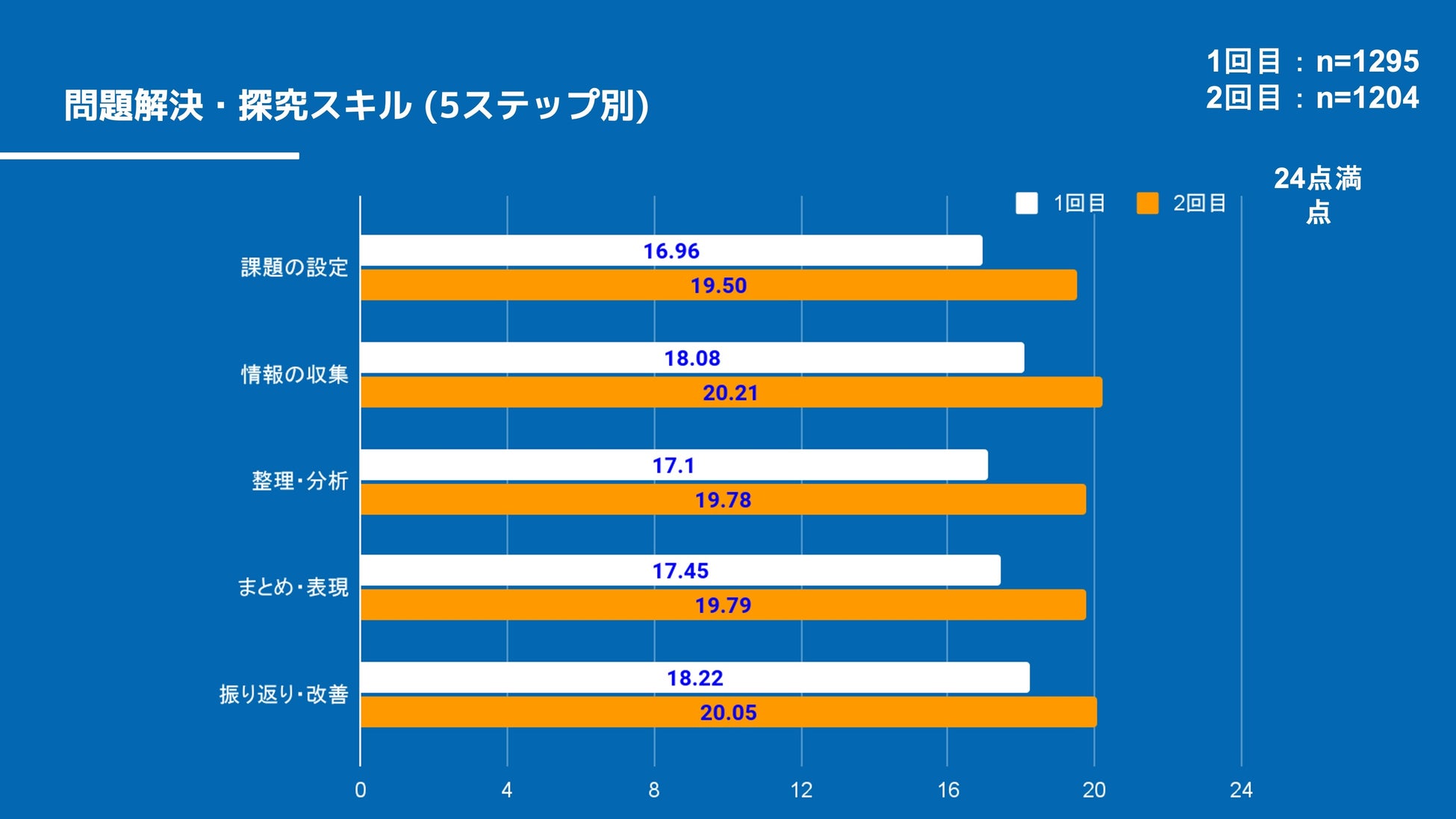 また、問題解決・探究スキルをさらに細分化した項目についても、「課題の設定」が15%、「情報の収集」が12%、「整理・分析」が16%、「まとめ・表現」が16%、「振り返り・改善」が12%の向上が見られました。