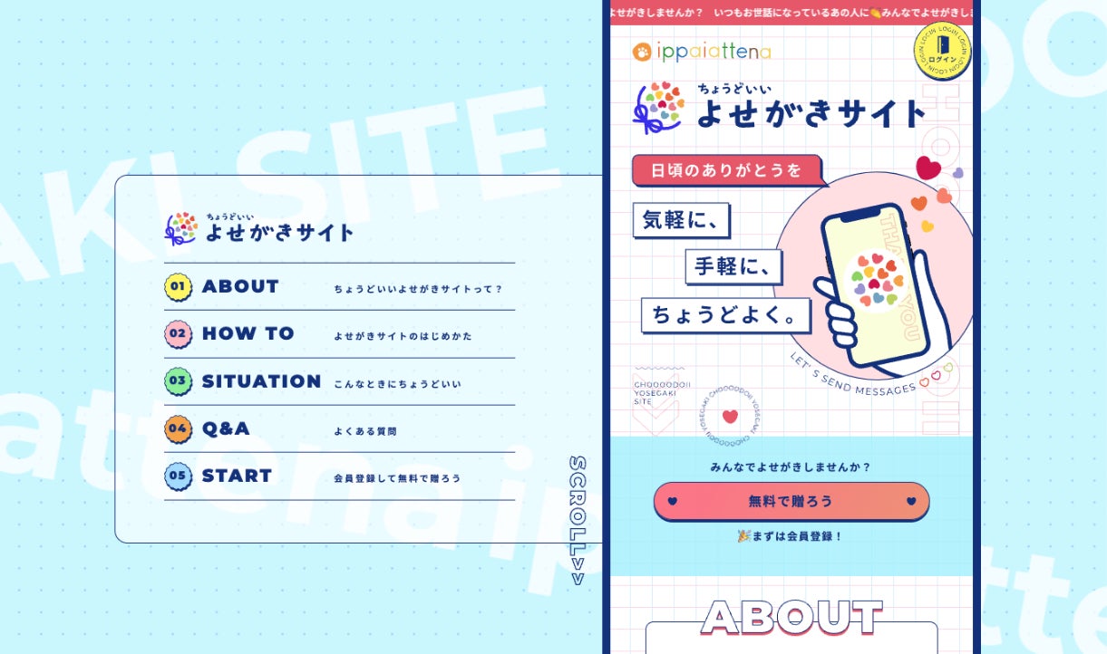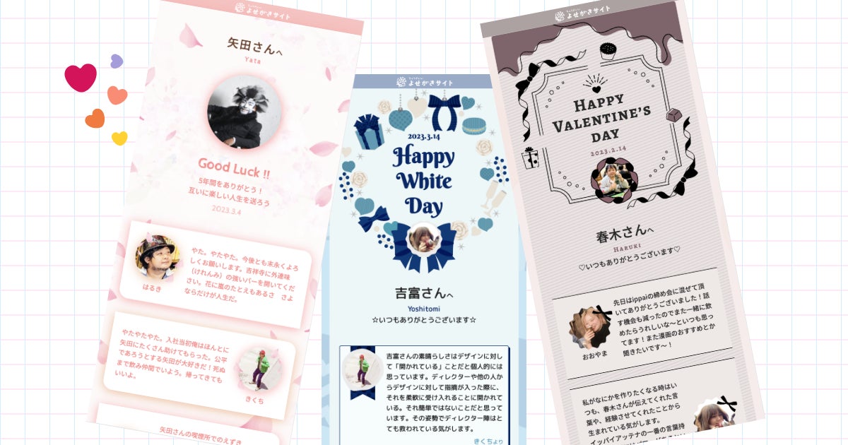 「ちょうどいいよせがきサイト」とは、バレンタインや送別会、卒業式などのシーンで必要不可欠なよせがきをWeb上で集めて贈れる無料サービスです。