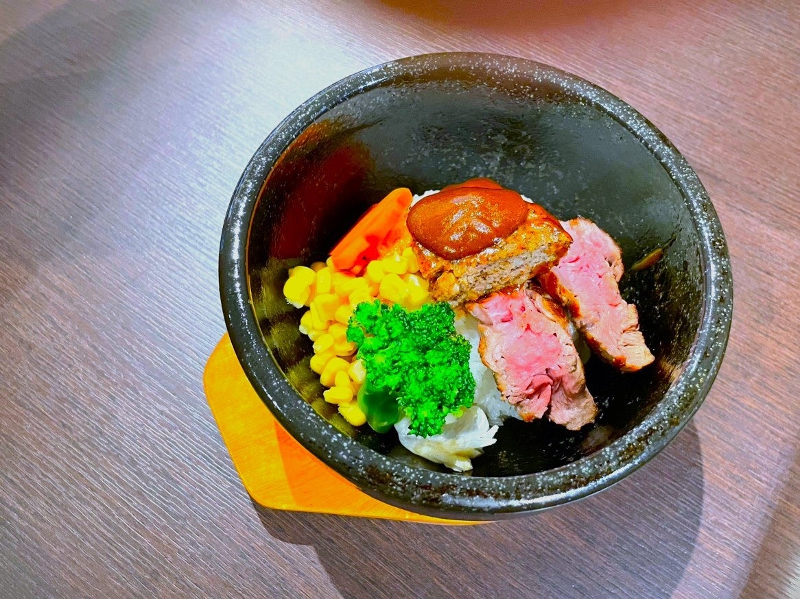 メニュー:①肉超ハンバーグ&ステーキビビンバ(たかきびハンバーグと牛肉ステーキ)