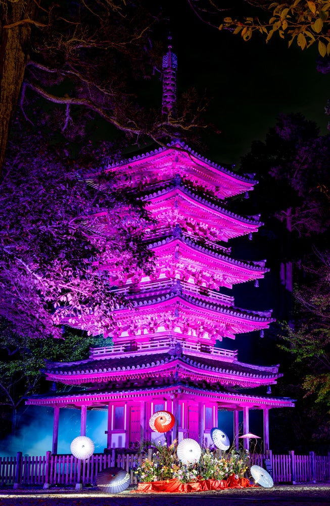 現存の五重塔では、法隆寺と海住山寺のみでしか見られない初層の裳階や五重塔としては室生寺に次いで小さい凛とした姿の塔身が、美しい光を纏って夜空に浮かび上がります。