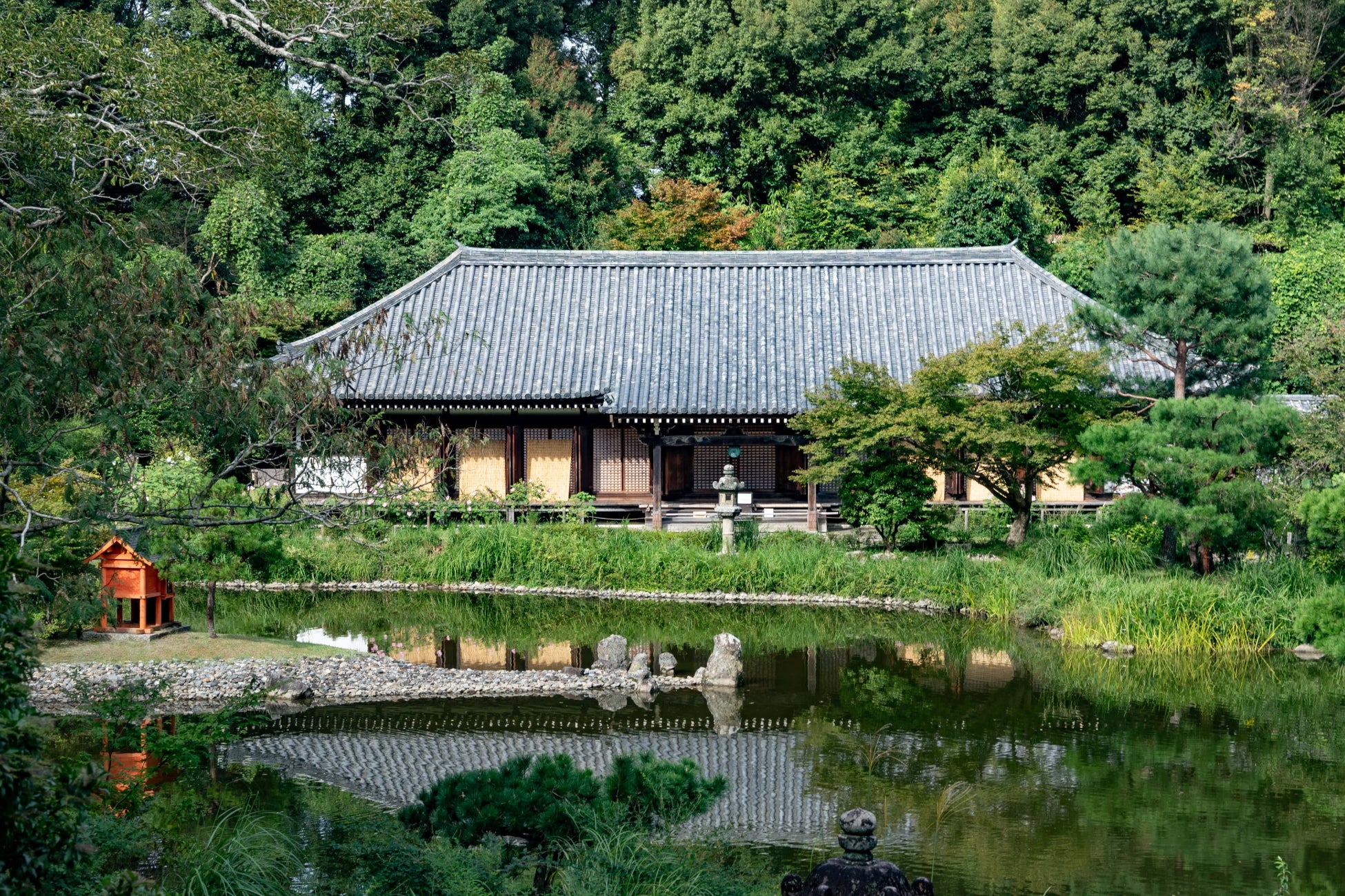 極楽浄土を表現した庭園は、国の特別名勝に指定されており、宝池を中心に、西に本堂・九体阿弥陀仏、東に三重塔・薬師如来を祀る平安時代の形を今に伝えています。