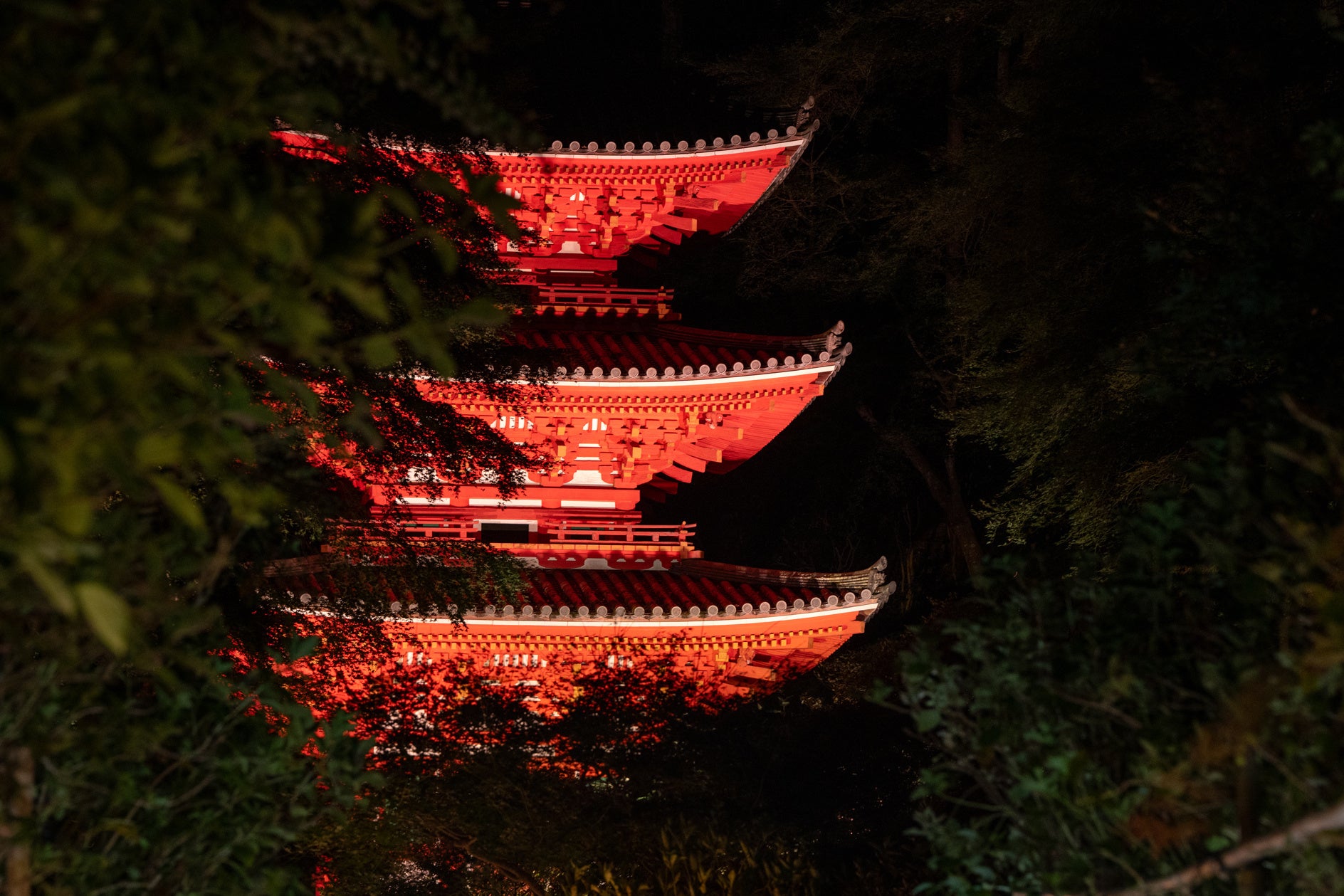 三重塔の朱が映えるライトアップにより、四隅の垂木を支える隅鬼も鮮やかに見ることができます。