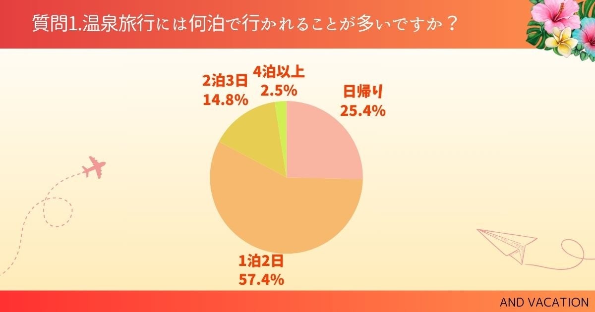 温泉旅行は1泊2日で行く人が多数!日帰り温泉旅行に行く割合も多い模様