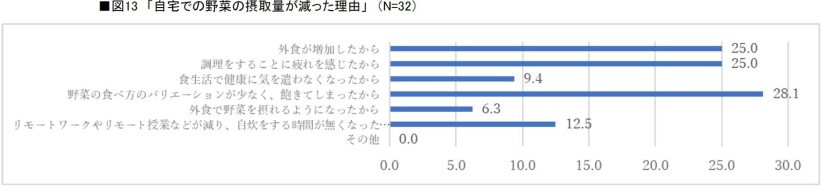 同率2位の「外食が増加したから」(25.0%)、4位の「リモートワークやリモート授業が減り、自炊する時間が無くなったから」(12.5%)のように、自宅で野菜を摂取する機会が減ったことも要因にあげられます