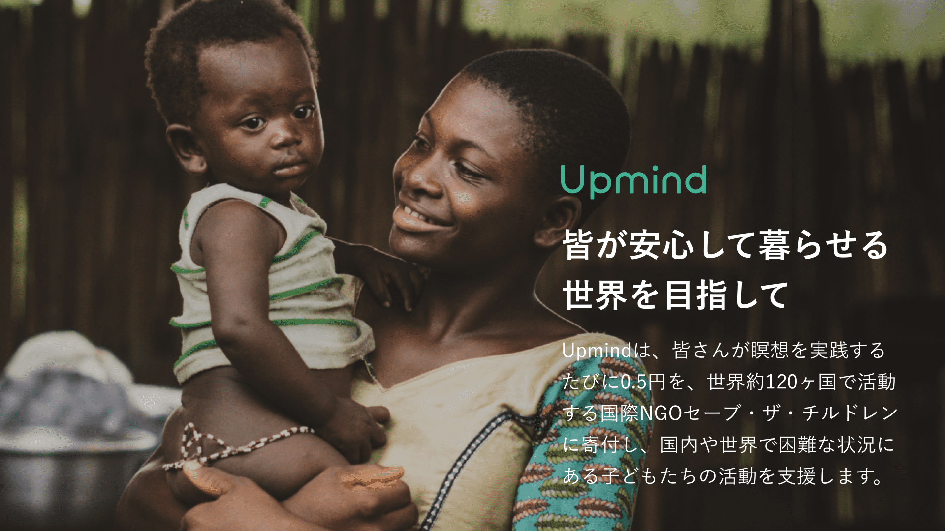 セーブ・ザ・チルドレンは、子どもの権利のパイオニアとして100年以上の歴史(1919年に創設)を持つ、子ども支援専門の国際NGOです。現在、日本を含む30ヶ国の独立したメンバーが連携し、約120ヶ国で子ども支援活動を展開。約100年にわたり、「子どもの権利」が実現された世界を目指し、栄養不良、感染症の予防や治療など保健・栄養をはじめ、他に人道支援や教育など幅広い分野を中心に子供たちの支援を行っています。Upmindは、今回、ユーザーの方が瞑想を実践するたびに0.5円をセーブ・ザ・チルドレンに寄付し、国内や世界で困難な状況にある子どもたちの活動を支援します。