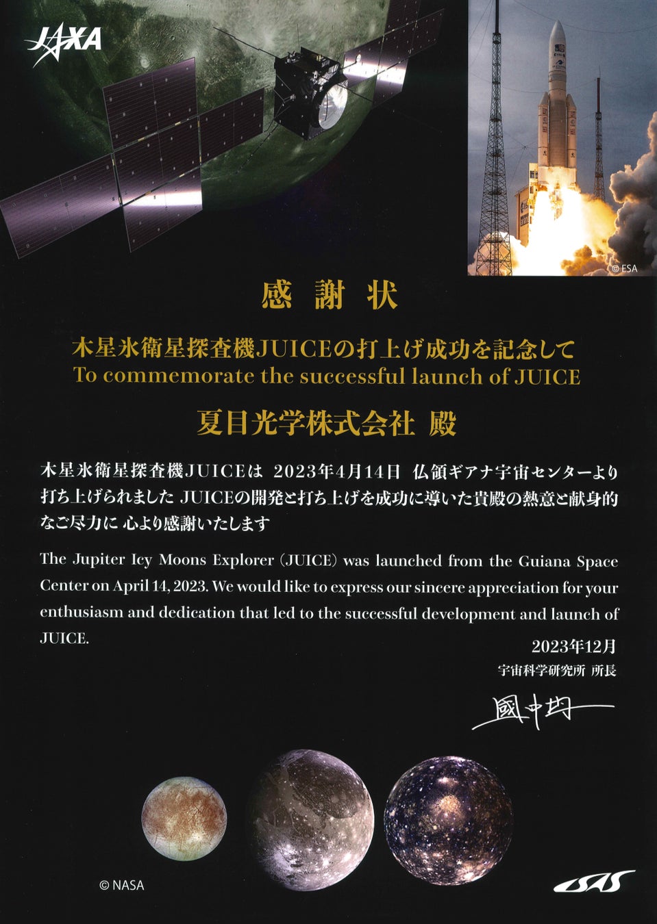 夏目光学、木星氷衛星探査機JUICEの打上げ成功を記念してJAXAから感謝状を受領