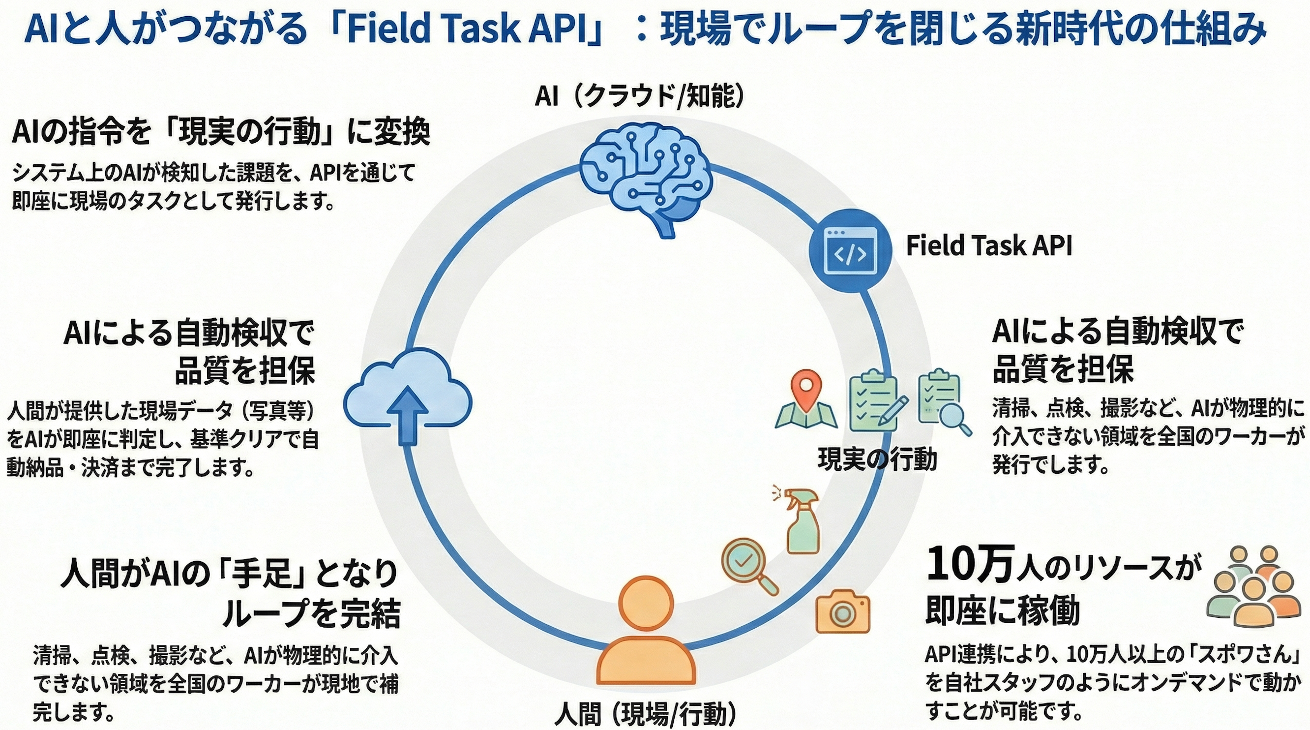 あわせて、この「安心できる高品質な人的ネットワーク」に対し、AIエージェントや基幹システムからAPI経由で直接業務を発注できる機能(Field Task)を公開し、物流・小売・不動産業界などで現場オペレーションのDXを目指すパートナー企業の募集を開始します。