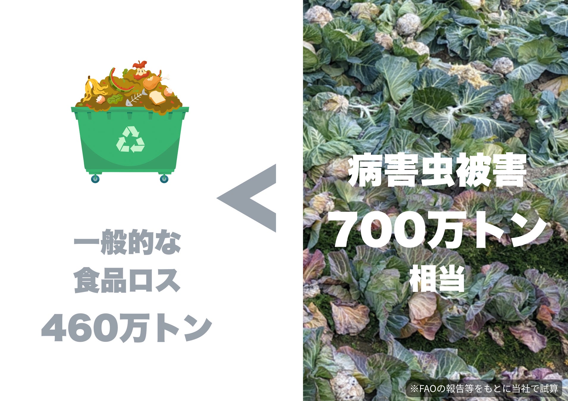 日本国内の農産物の病害虫被害を試算すると年間約700万トン相当。一般的に認知されているフードロス(約460万トン)を上回る規模でありながら、社会的な認知はほとんど進んでいません。