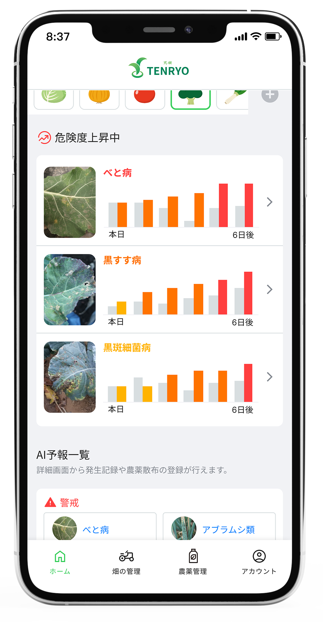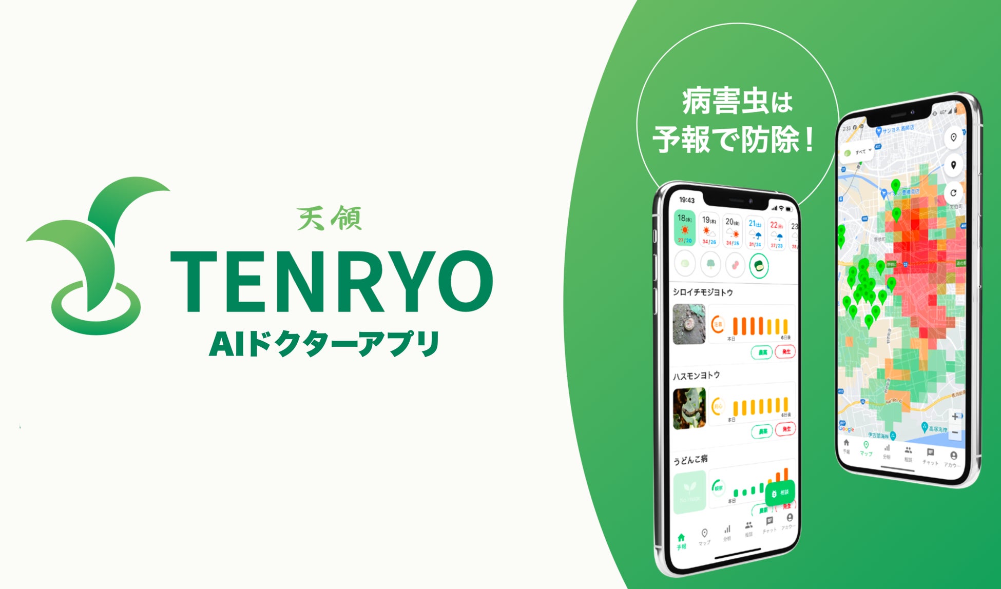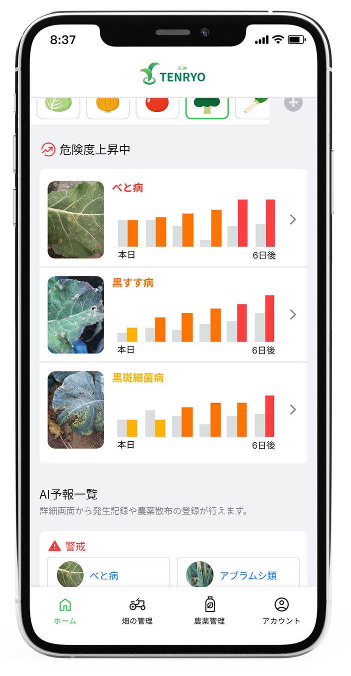 ミライ菜園が開発した「TENRYO」は、20年分の気象データと病害虫の発生履歴を学習した独自のAIが、直近の気象データなどを分析。1週間後の発生の危険リスクを事前にアラートする病害虫予測アプリです。