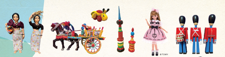 子どもたちの身近にあるおもちゃは、小さなものでありながら、色や形、材料など、その風土や環境、そしてその時代があらわれています。国が違っても同じ仕組みのものや、同じおもちゃであっても地域によって造形や色彩感覚の違うものなどから、世界各国・地域の暮らしや文化の様子を知ることができます。