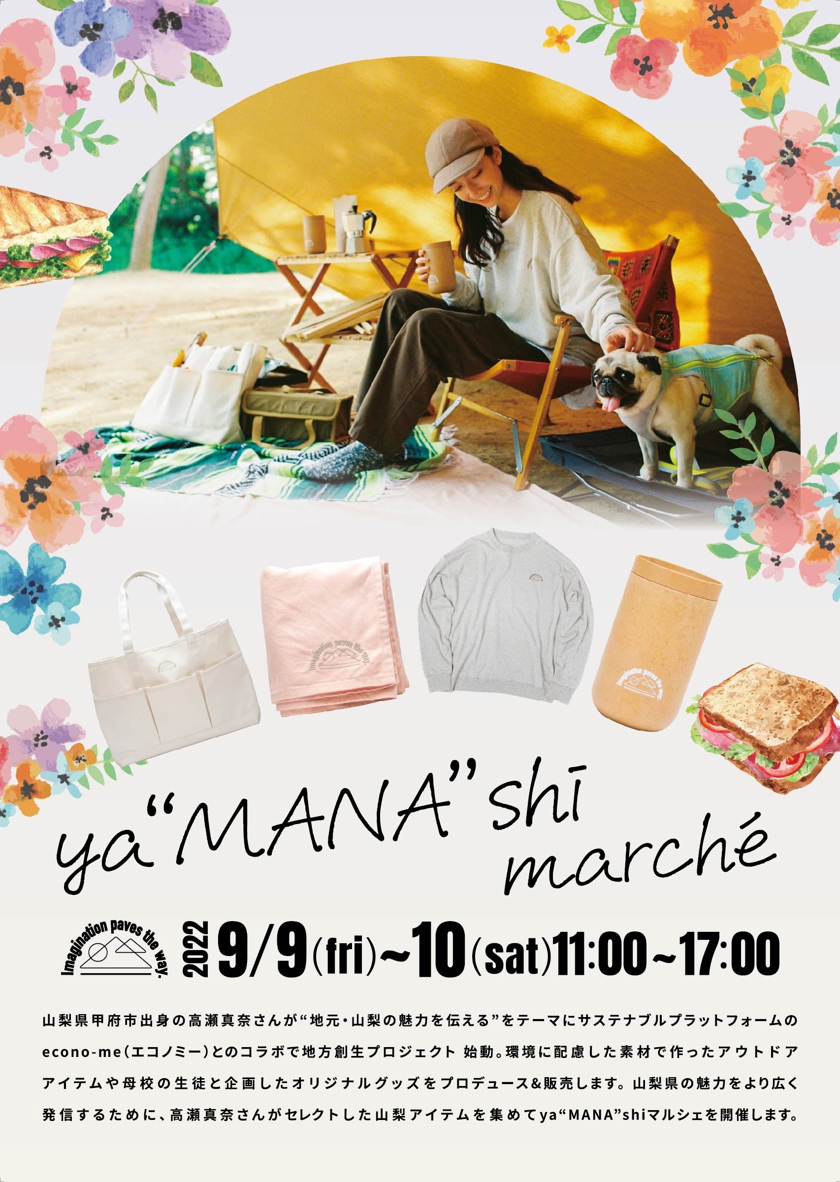 「ya“MANA”shi marché」は、あらゆる側面から山梨の魅力を体感してもらうことを目的に、高瀬真奈さん自身がセレクトした山梨県に関連する人、もの、ことを集めたマルシェ形式でのイベントです。会場では、本企画のメインである高瀬真奈さんプロデュースのオリジナルアウトドアグッズの販売のほか、山梨県の野菜や雑貨などを販売するショップが参加予定です。