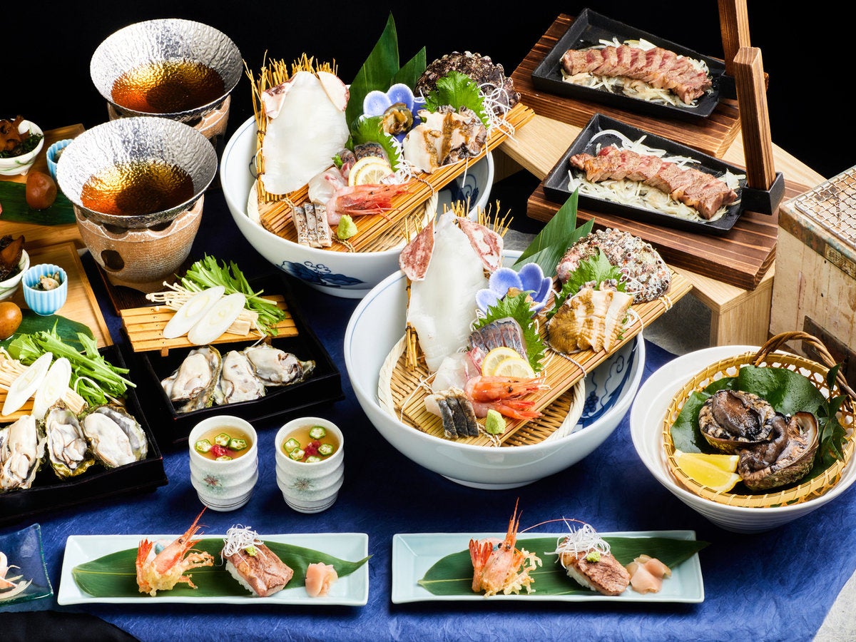 香住の夏の風物詩である活きたまま水揚げされる「活イカ」の姿造りがついた「活イカプラン」をはじめとした、夏を感じていただけるお食事をご用意いたしました。