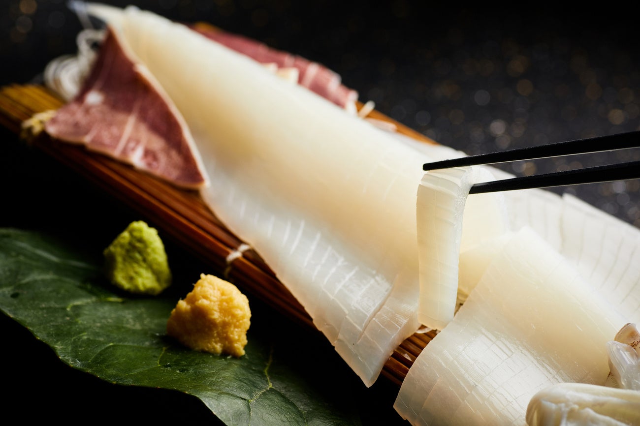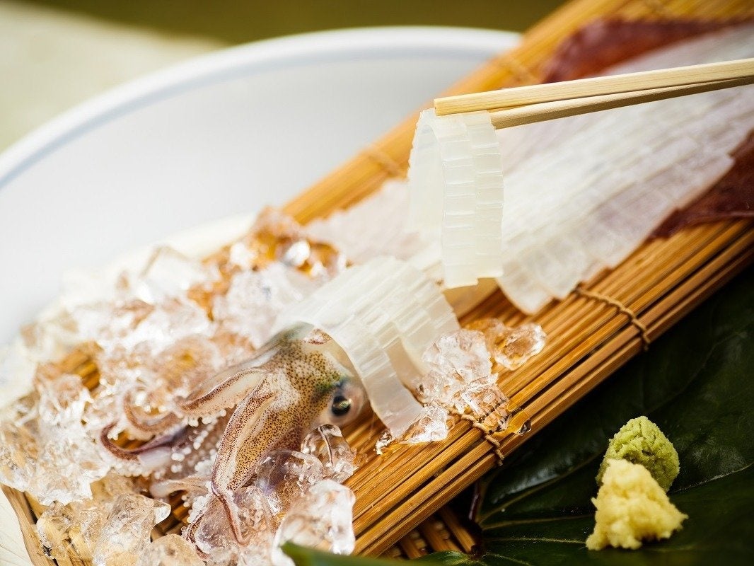 活きたまま目の前へ!コリコリとした食感と透き通った白イカを楽しむ「活白イカの姿造り付き会席」