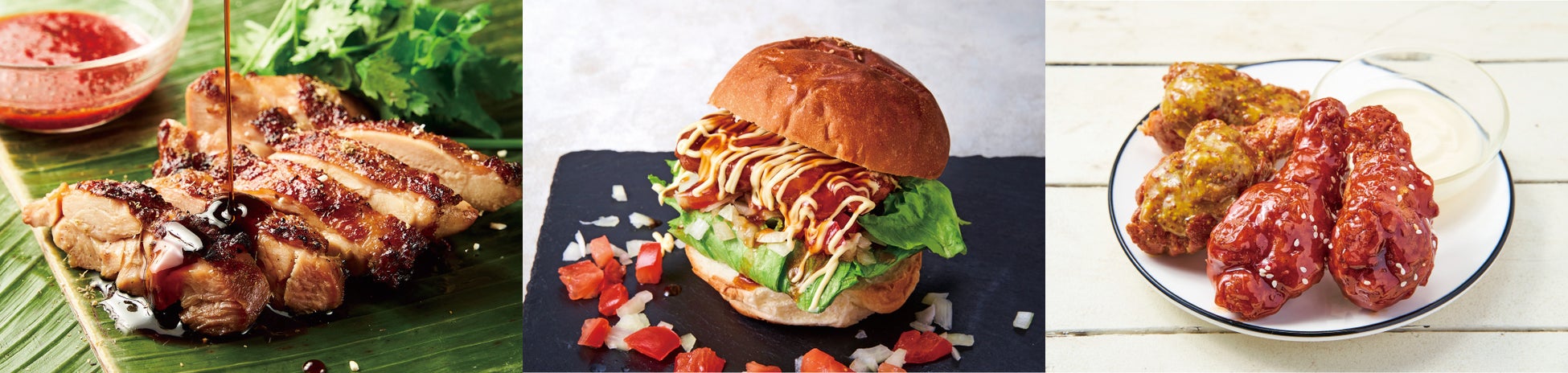 数種類のハーブとナンプラーなど、タイ特有の調味料にじっくり漬け込んだ鶏もも肉を炭火で焼き上げたタイの郷土料理、<黒糖ココナッツソースのガイヤーン>。辛すぎない唐辛子にライム果汁を加えたタイのイサーン料理を代表するソースをベースに、今トレンドのココナッツ&黒糖を使用した特製ソースで提供するのは【玉川精肉店】。 ハンバーガーの人気店【WORLD DINER】は、THE・ジャパニーズバーガーの<照り焼きチキンバーガー>を引っ提げて登場。ジューシーに柔らかく焼き上げたチキンに甘辛照り焼きソースを絡めた、誰もが好きな黄金の組み合わせ。オーダーメイドのバンズは、表面はカリッとツヤツヤながら、フワっと柔らかな生地がしっかりと肉汁とソースを受け止めます。 近年、鶏肉料理の新王者を狙う<やみつき旨辛ヤンニョムチキン>は、【The 3rd.Shibuya】から。サクッと揚がった手羽元に、甘辛いヤンニョムソースと、辛いものが苦手な方も楽しめるハニーマスタードソースをたっぷりと絡めた逸品。練乳マヨネーズをたっぷりディップすることで、やみつきになること間違いなし。さらに、日本を代表する大分唐揚げのほか、タンドリーチキン、チキンケバブ、バインミー、鶏餃子、タッカルビなどが登場予定。