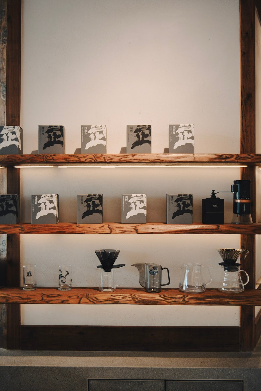 商品棚は、珈琲関連商品の他、グラス等のオリジナルグッズも販売しておりその場で楽しめるドリンクやフードだけでなく日頃からコーヒーを楽しむためのグッズが揃っております。