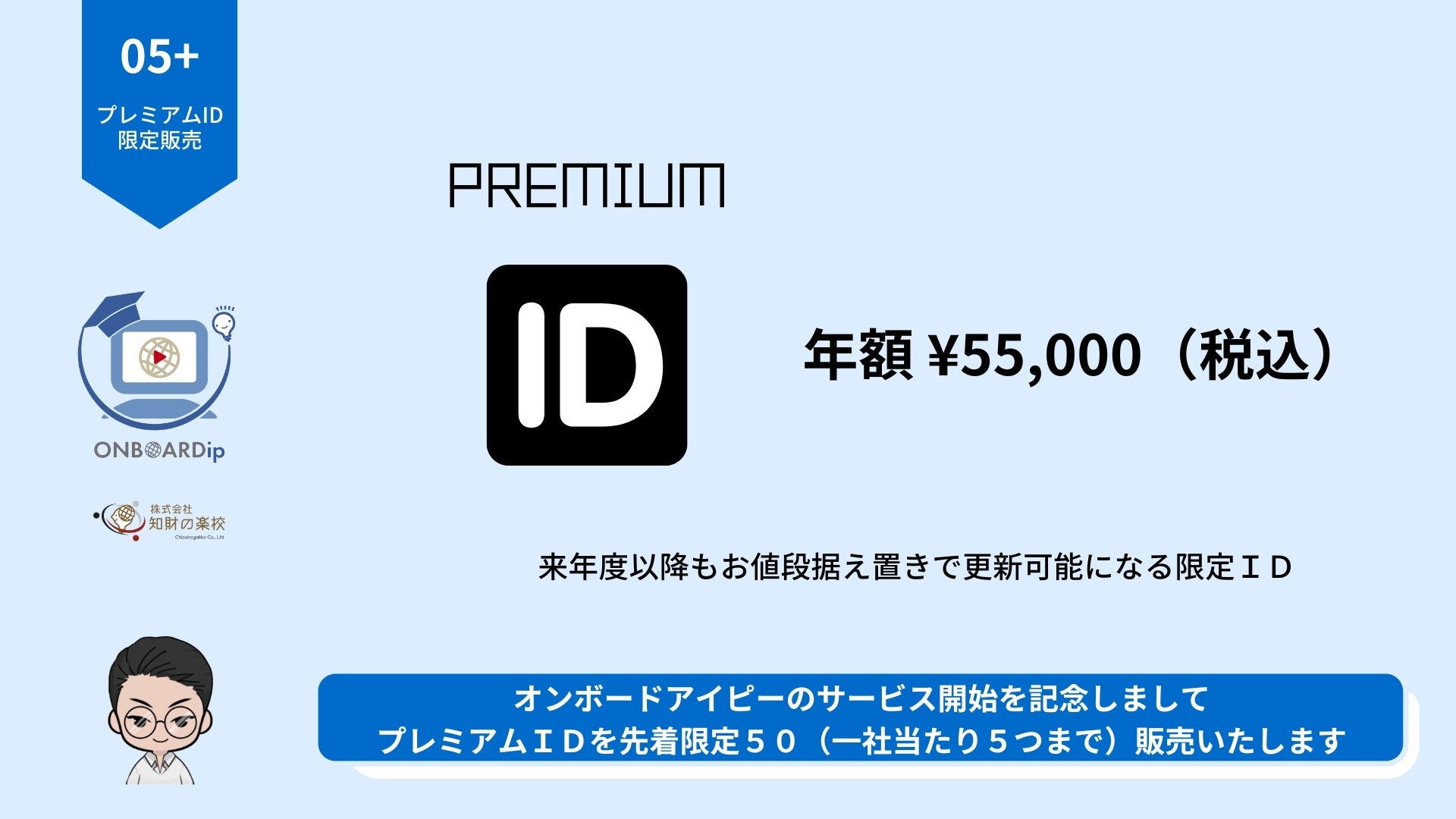 オンボードアイピーのサービス開始を記念して、9/2~30の期間でプレミアムIDを先着限定50(1社当たり5つまで)を予約販売いたします!オープン価格では年額99,000円(税込)であるところ、プレミアムIDは55,000円(税込)、来年度以降もこの価格で更新し続けられる先行者限定版です!今週からお申込みを開始しましたので、ご興味がある方は以下のページを職場内で共有してご検討いただければ幸いです(実装されるコンテンツの一例も掲載しています)。来年度からの新人教育に備えて、まずはIDを一つ手に入れて内容の確認と教育プランの事前検討をすることもオススメです。