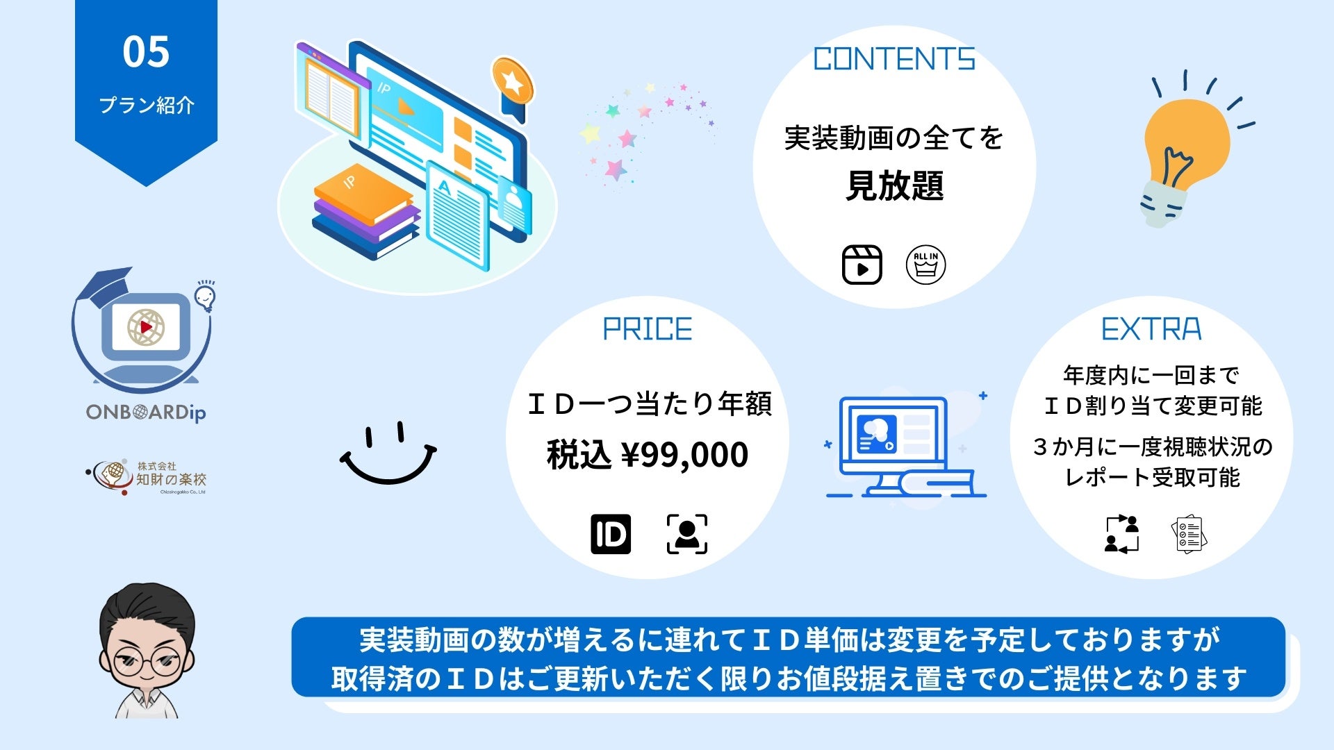 IDは年間払いの更新制でe-Learningシステムに実装された全動画が見放題!コンテンツはサービスリリース後に続々と追加を予定しており、時間を追う毎に進化していくタイプのプラットフォームです。そのため、コンテンツ数が増えるに連れて単価の改定がありますが、早いうちから本サービスをご利用くださったお客様に負担なく教育環境を維持していただけるように取得時のお値段据え置きで毎年更新可能です。