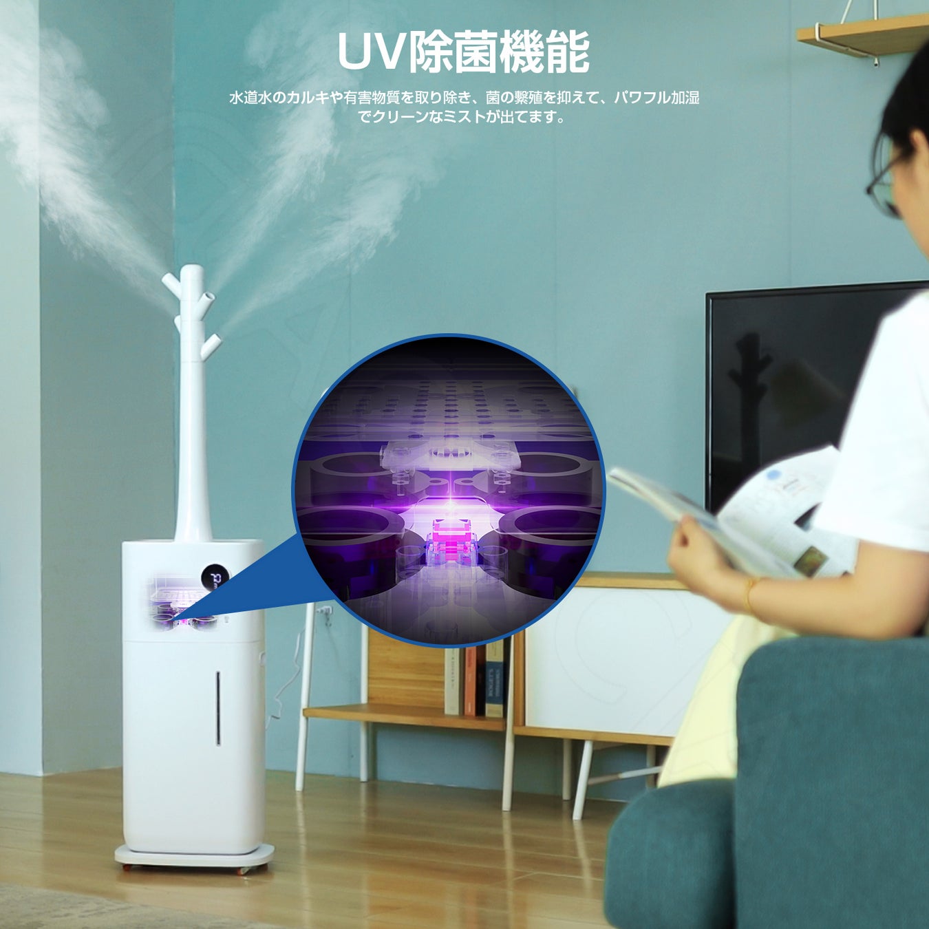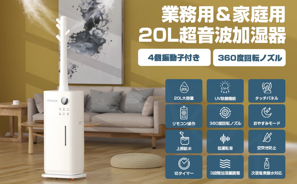 業務用20L加湿器 4つノズル付き 360度回転 大容量 3段階加湿量調整 UV除菌 次亜塩素酸水対応 4つ超音波振動子 20時間連続加湿