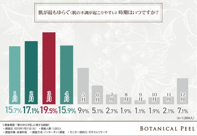 「肌が最もゆらぐ(肌の不調が起こりやすい)時期はいつですか?」と質問したところ、『3月(19.5%)』と回答した方が最も多く、次いで『2月(17.1%)』『4月(15.9%)』『1月(15.7%)』と続きました。