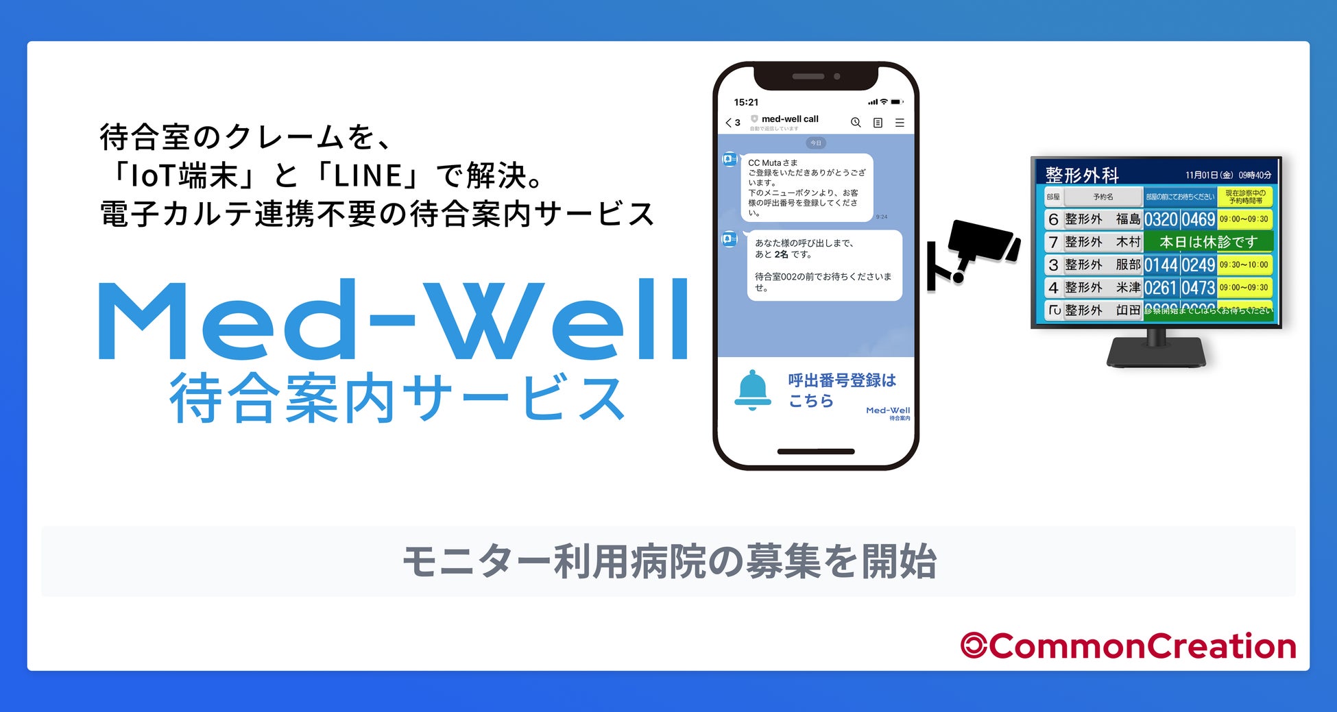 総合病院向けのLINEクラウドサービスを展開するコモン・クリエーション株式会社(本社:福岡県福岡市、代表取締役:牟田 和貴)は、IoT・AI技術とLINEを活用し、患者さまの呼び出しを自動で通知する「Med-Well待合案内サービス」の提供を開始いたします。