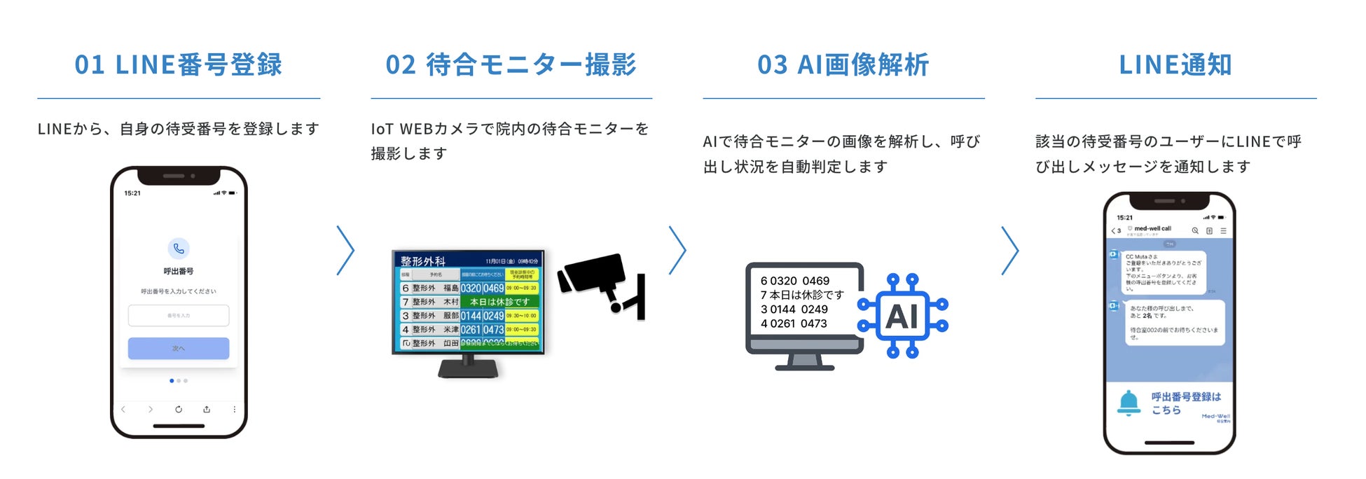 Med-Well待合案内サービスは、病院内の案内モニターをIoT端末やWEBカメラで撮影し、AIが番号表示を解析。LINE公式アカウントを通じて、患者さまのスマートフォンにリアルタイムで呼び出し通知を送信するサービスです。