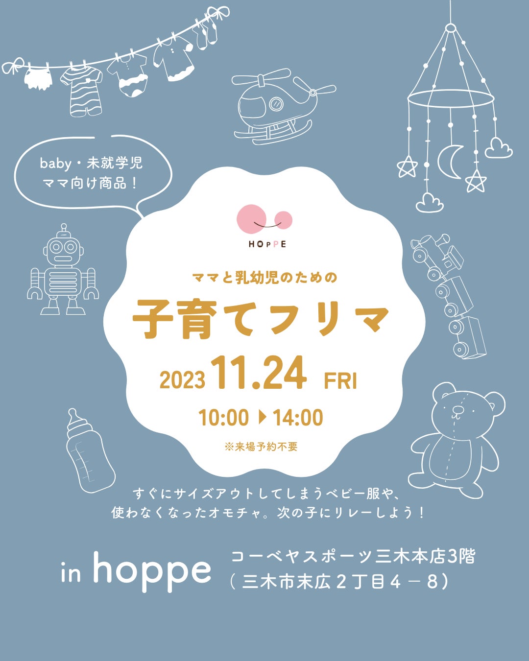 特定非営利活動法人ほっぺ(代表:大森 奈津子)によるベビー用品、衣類、ママ向けグッズを中心としたフリーマーケットを、11月24日(金)にhoppe(コーベヤスポーツ三木本店3階)にて、「赤ちゃんとママのための~ベビフリマ~」を開催いたします。