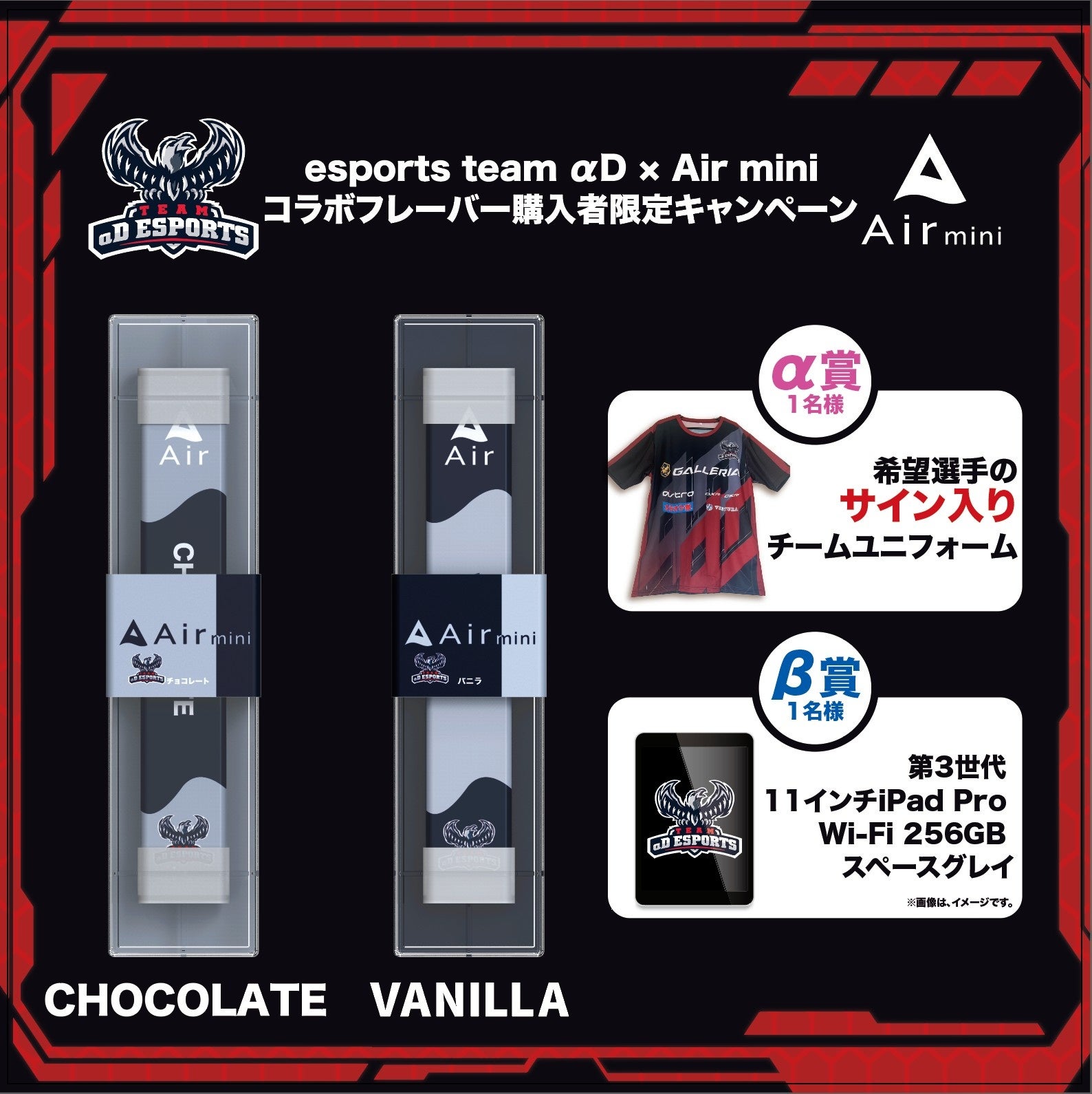 株式会社エアー(本社:東京都新宿区)は、シーシャブランドAirの大人気シリーズ「Air mini」と業界最大手e-sportsチーム「αD」のコラボオリジナルフレーバーを発売いたします。また、豪華景品が当たる購入者限定キャンペーンも開催いたします。