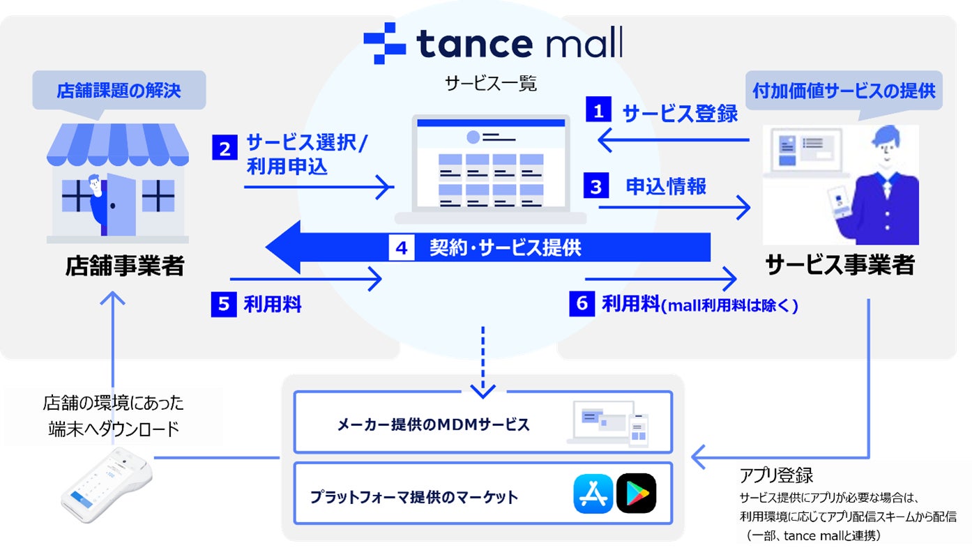 これにより「PayCAS Mobile」を使用する店舗事業者は、「PayCAS Mobile」のキャッシュレス決済機能に加え、「tance mall」上で集客強化や業務効率化、販路拡大などのサービス事業者の付加価値サービスを簡単に利用することができます。