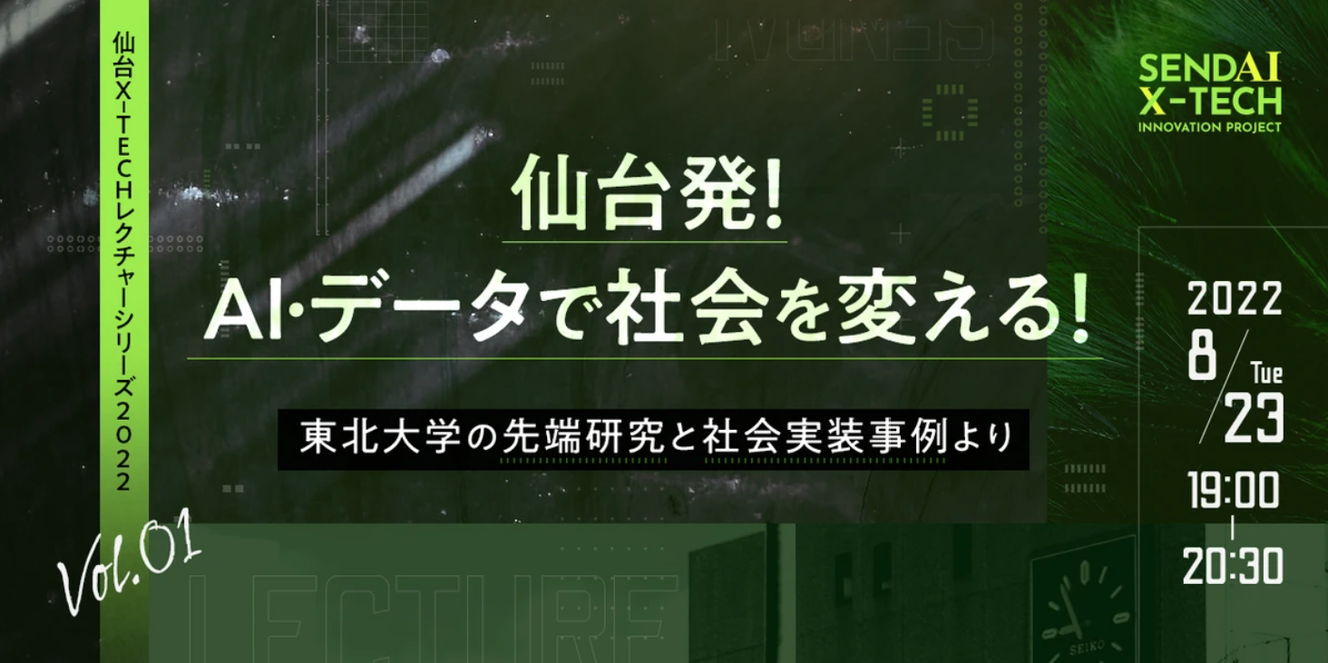オンライン講演 視聴者募集開始 仙台X-TECHレクチャーシリーズVol.1『仙台発!AI・データで社会を変える! 〜東北大学の先端研究と社会実装事例より〜』開催