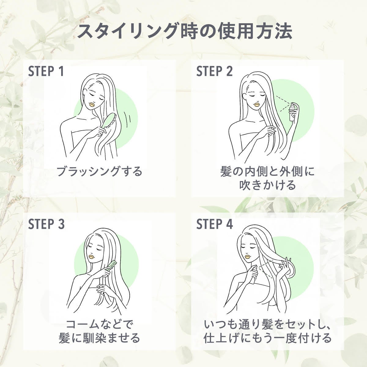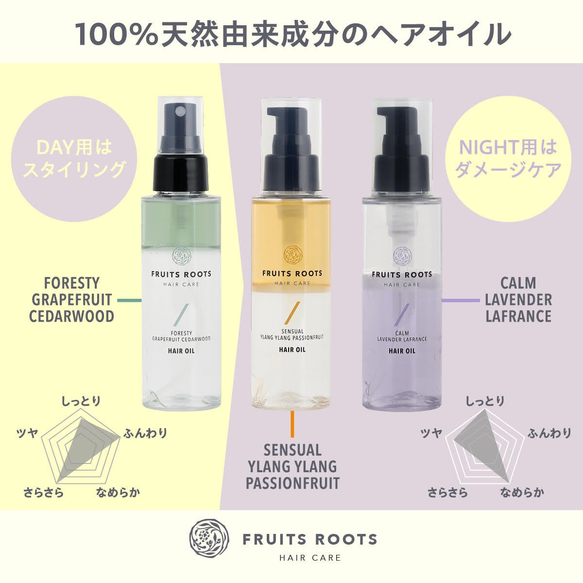 スプレータイプのFORESTYは油層2:水層8の配合で、軽めのテクスチャです。お風呂上がりの髪の保湿ケアのみならず、お出かけ前のスタイリングにも使っていただけます。SENSUALとCALMは油層4:水層6の配合で、少し重めのテクスチャです。ツバキ油やヒマワリ種子油などの良質な植物由来の成分とアミノ酸成分が、毛先のダメージを補修し、自然なツヤも与えます。