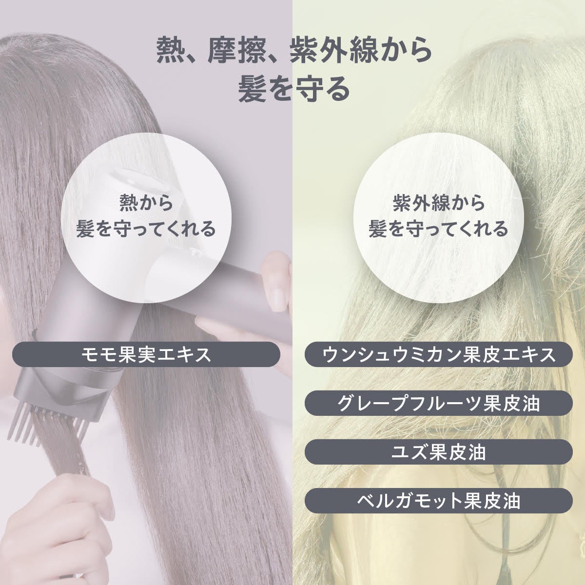 敏感肌にも優しく、熱、摩擦、紫外線から髪を守ります。モモ果実エキスのピーチラクトンが耐熱補修効果を発揮し、ウンシュウミカン果皮エキスの陳皮エキスが紫外線から髪を保護。油層4:水層6の配合で毛先のダメージを補修し、ツバキ油やヒマワリ種子油、アミノ酸成分が自然なツヤを与えます。夜用のヘアオイルでもあり、イランイランとパッションフルーツの香りが心を落ち着けてくれます。