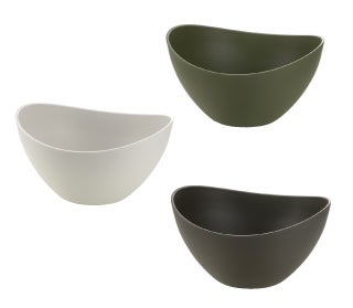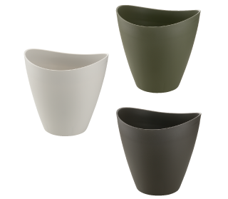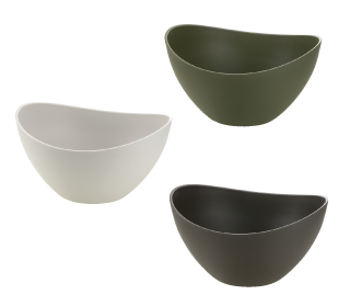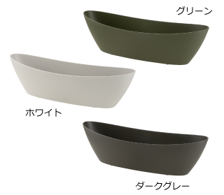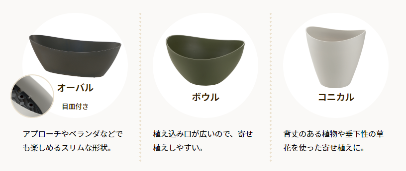 ギャザリンのプランターはオーバル、ボウル、コニカルの3種類。色んなシーンで寄せ植えを楽しめます。カラーは3色展開で、シックでモダンなダークグレー、植物と馴染みの良いグリーン、明るく清潔感のあるホワイトとお庭やお家に合わせてお選びいただけます。