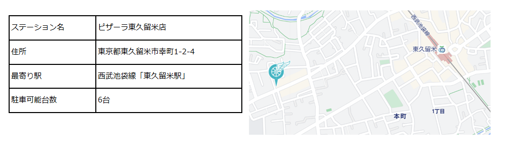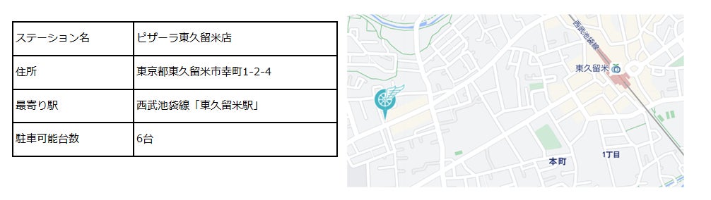 11月16日、西武池袋線「東久留米駅」徒歩11分のところにある「ピザーラ 東久留米店」にステーションを設置いたしました。初のピザーラ店舗、また初の東久留米市でのステーション設置となり、Shaeroの他のステーション同様に一般ユーザーがご利用いただけるステーションとなっております。