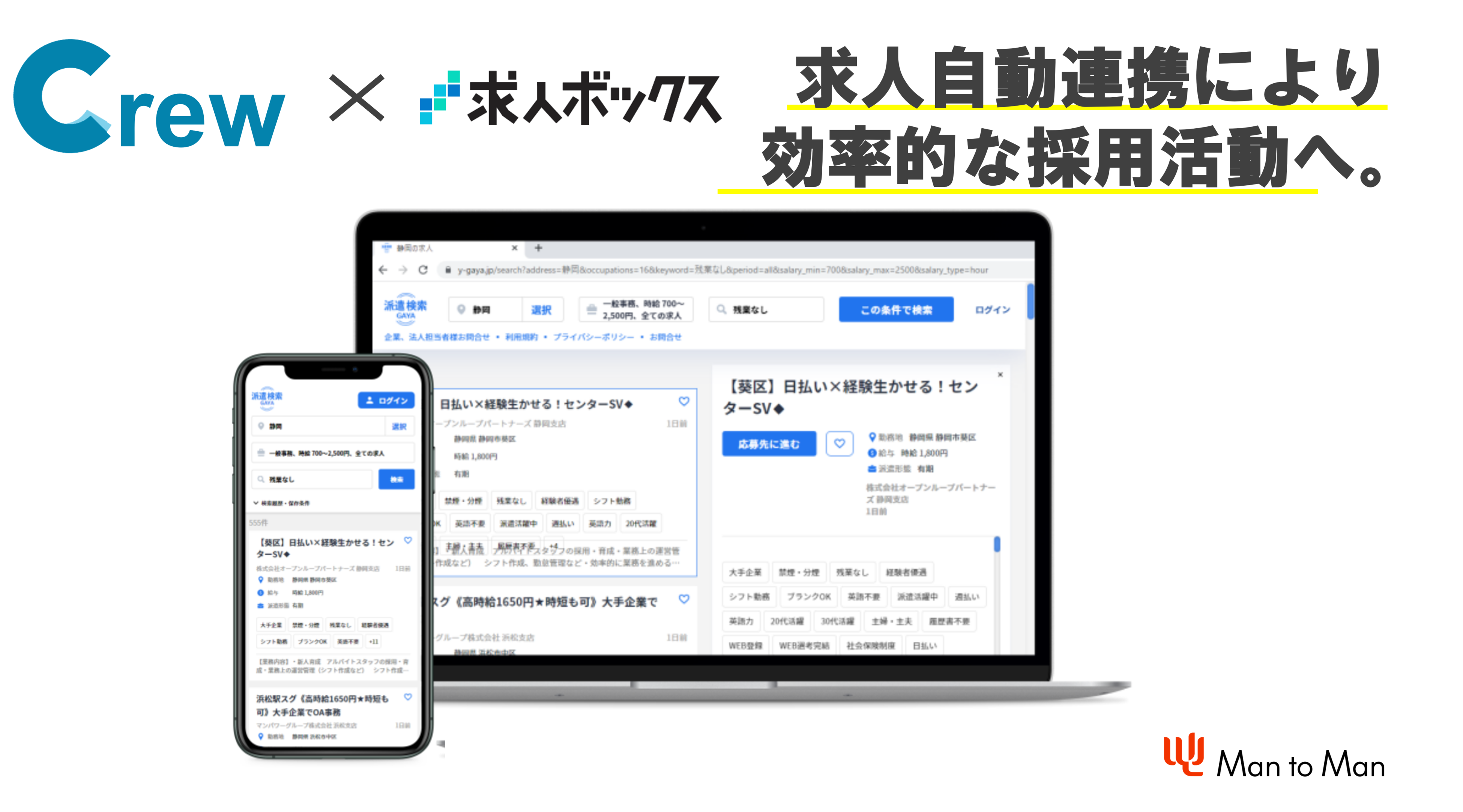 Man to Man 株式会社が人材派遣企業向け求人登録データベース「Crew(クルー)」と求人情報の一括検索サイト「求人ボックス」を連携