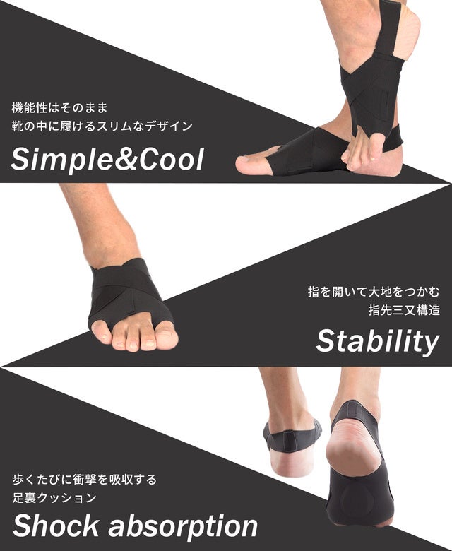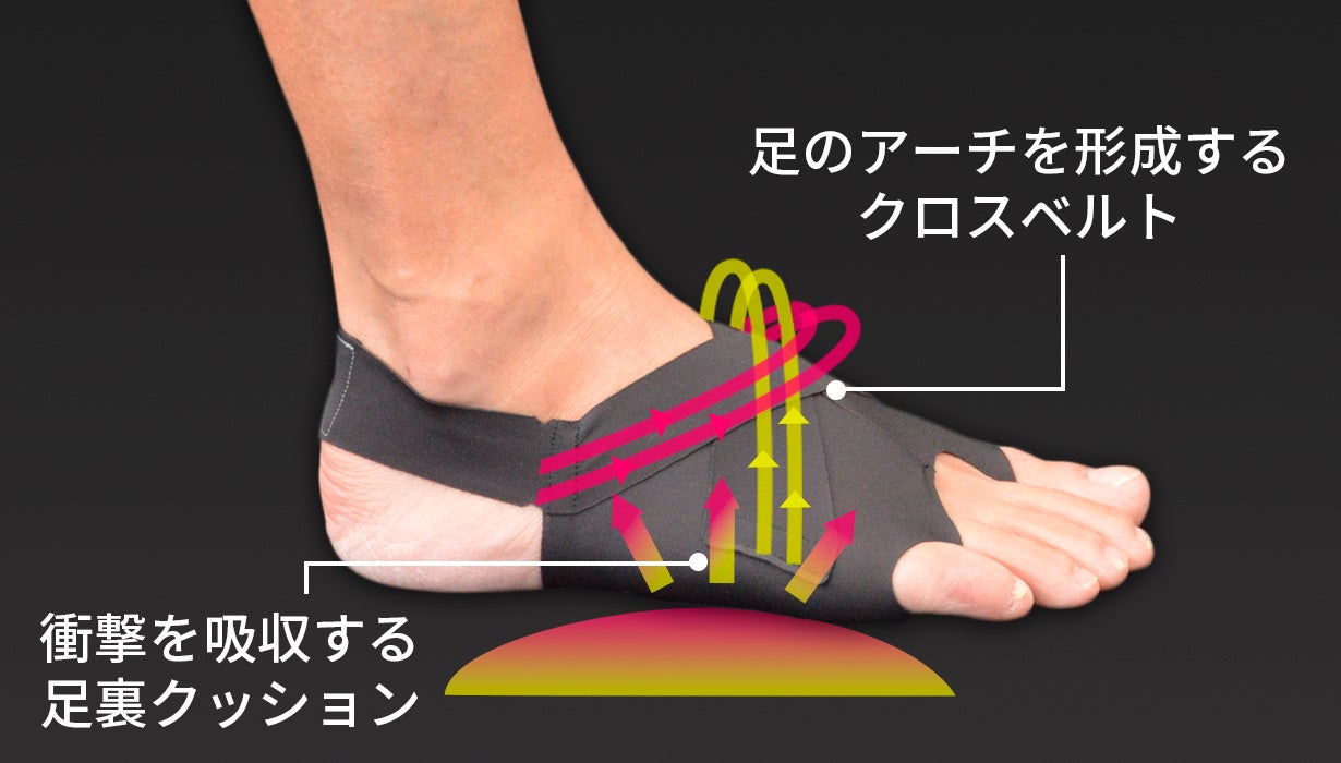 独自のクロスベルトで外側と横側のアーチをサポートし、さらに土踏まず部分にクッションを入れることで内側の縦のアーチを支え、地面からの衝撃も吸収し、履くだけで、歩くために必要な「3点アーチ」を形成します。