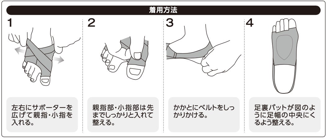 着用方法 :左右にサポーターを広げて足の指を入れ、指部分を先までしっかり入れて整えてください。