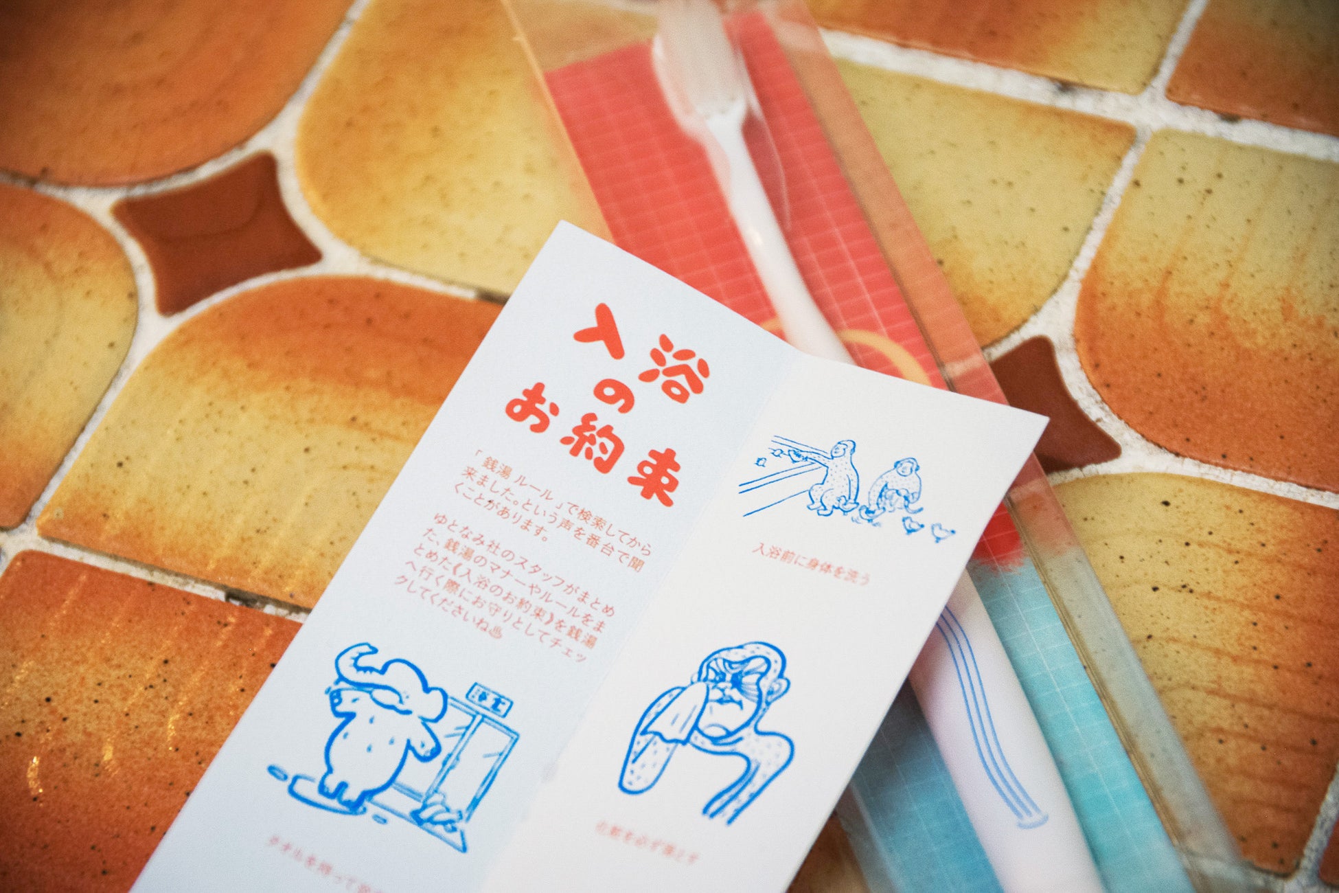 ・同封されている2つ折りの台紙の内側にはゆとなみ社のオリジナルイラストで「入浴のお約束」が描かれています。初めて銭湯に行く方でも安心して足を運んでいただけるよう願いを込めてお届けします。